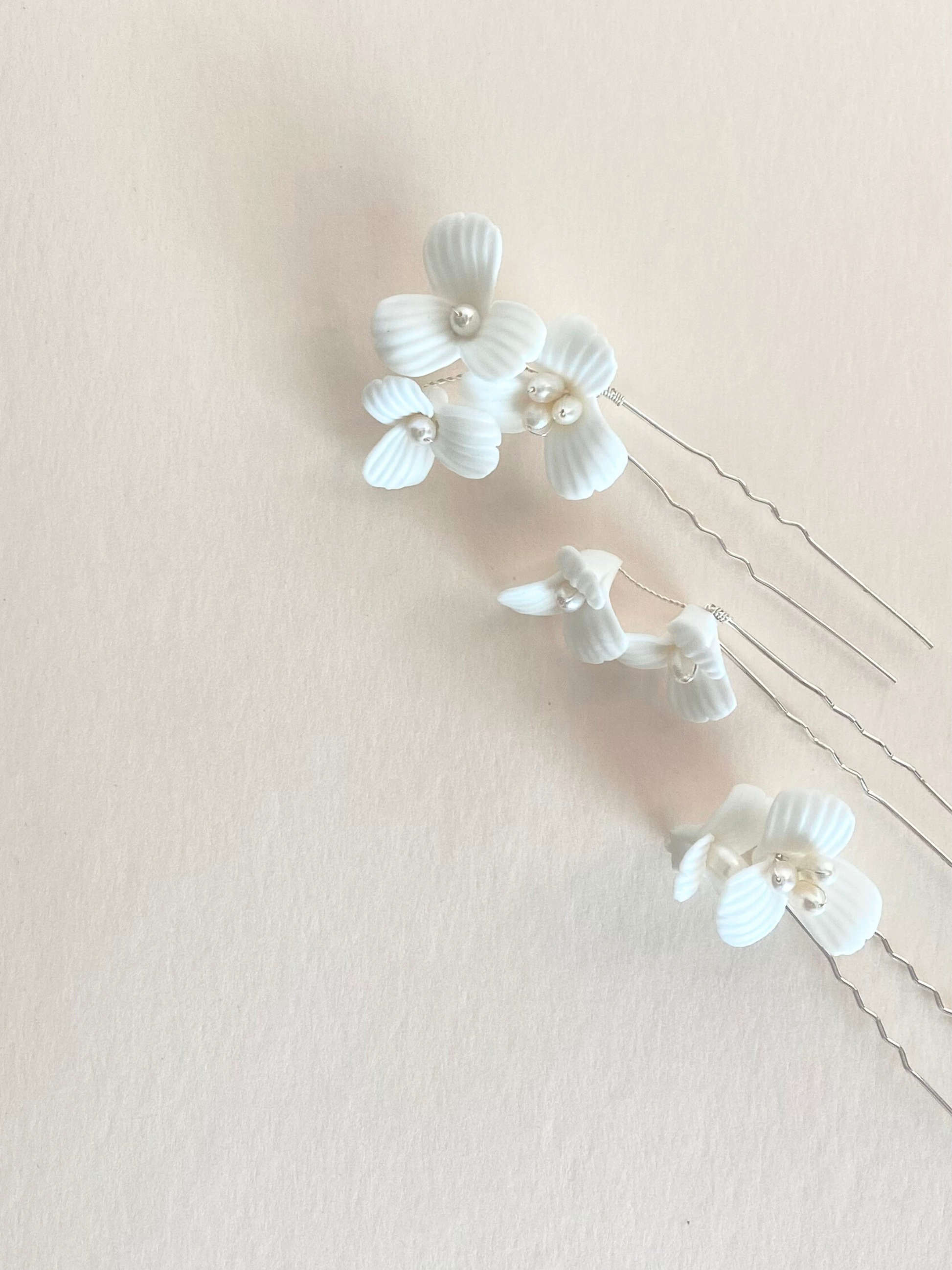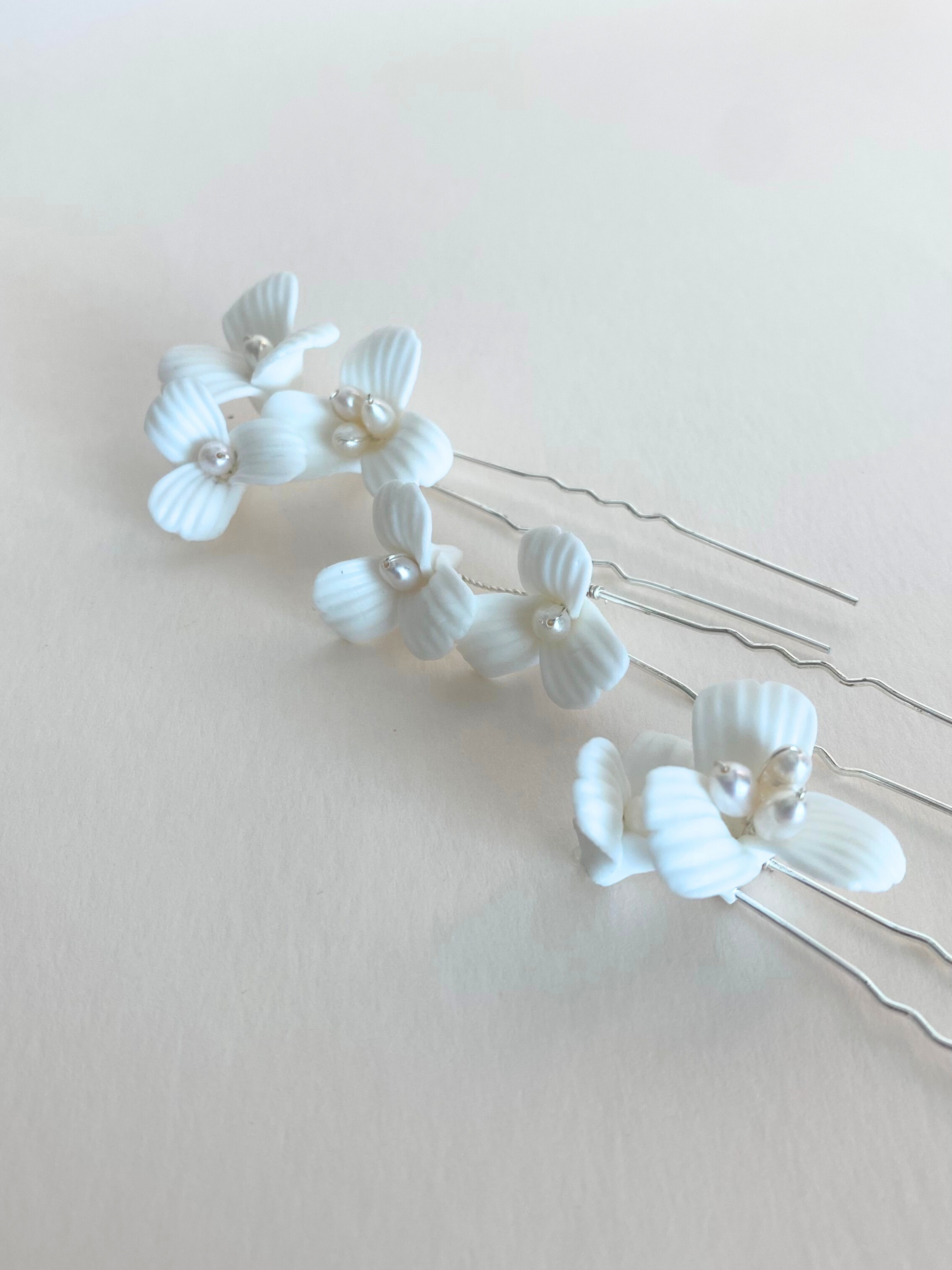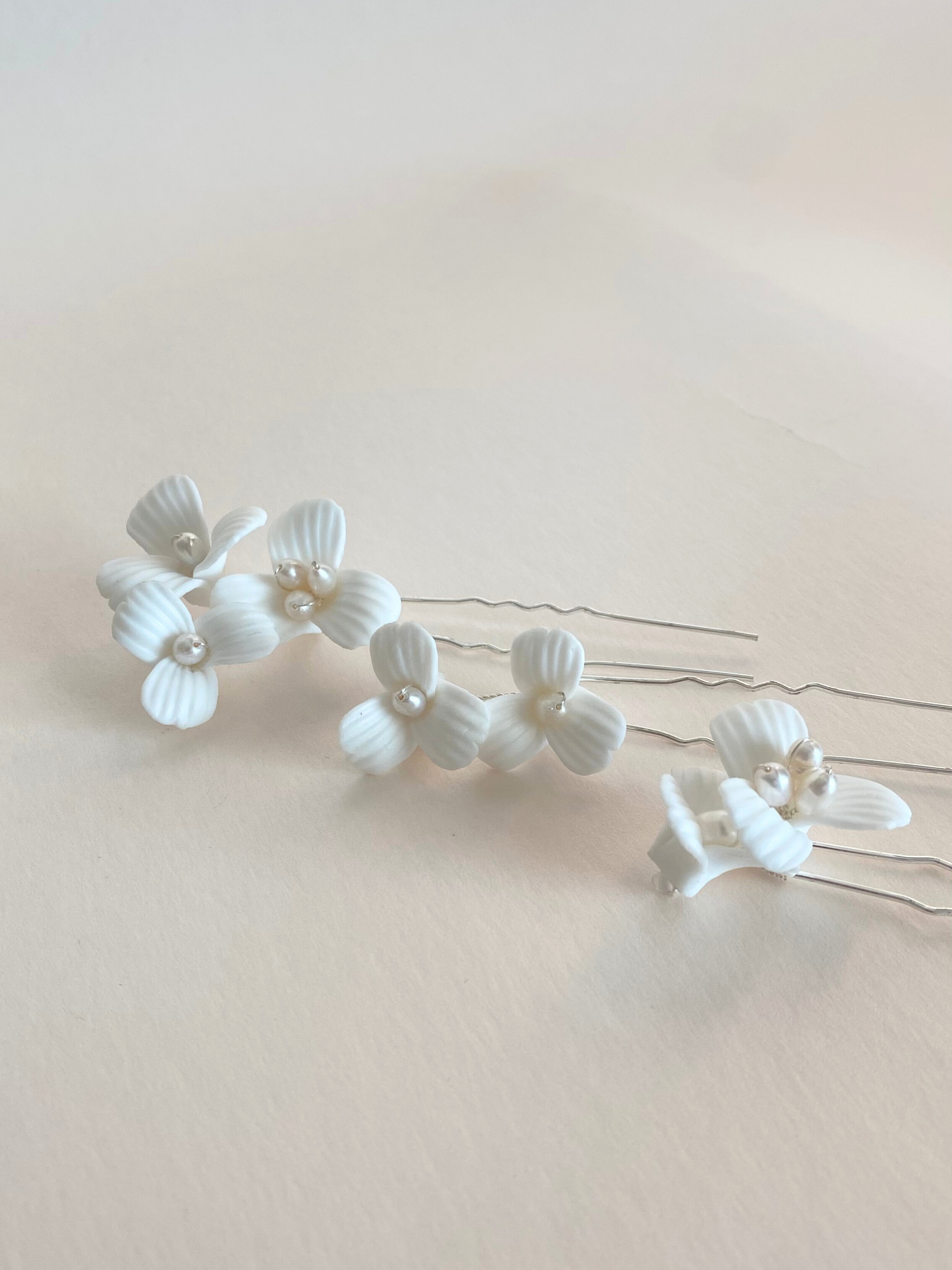 El paquete incluye 3 pines de porcelana de distintos tamaños, con base de alambre en tono plateado