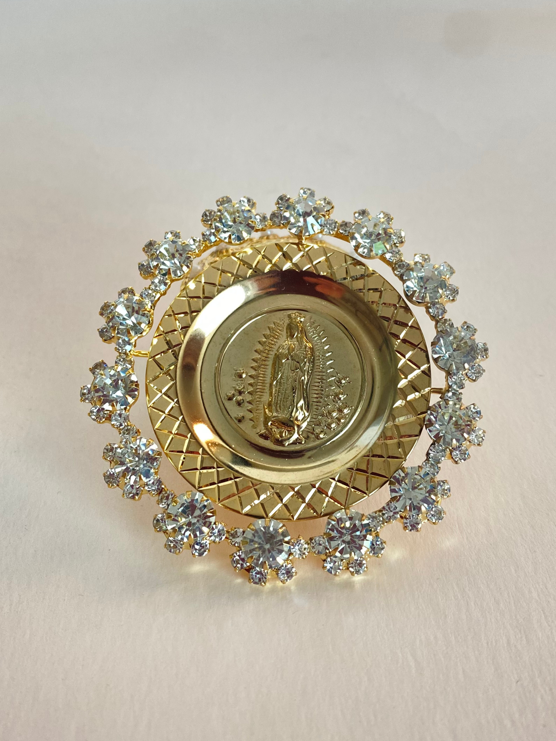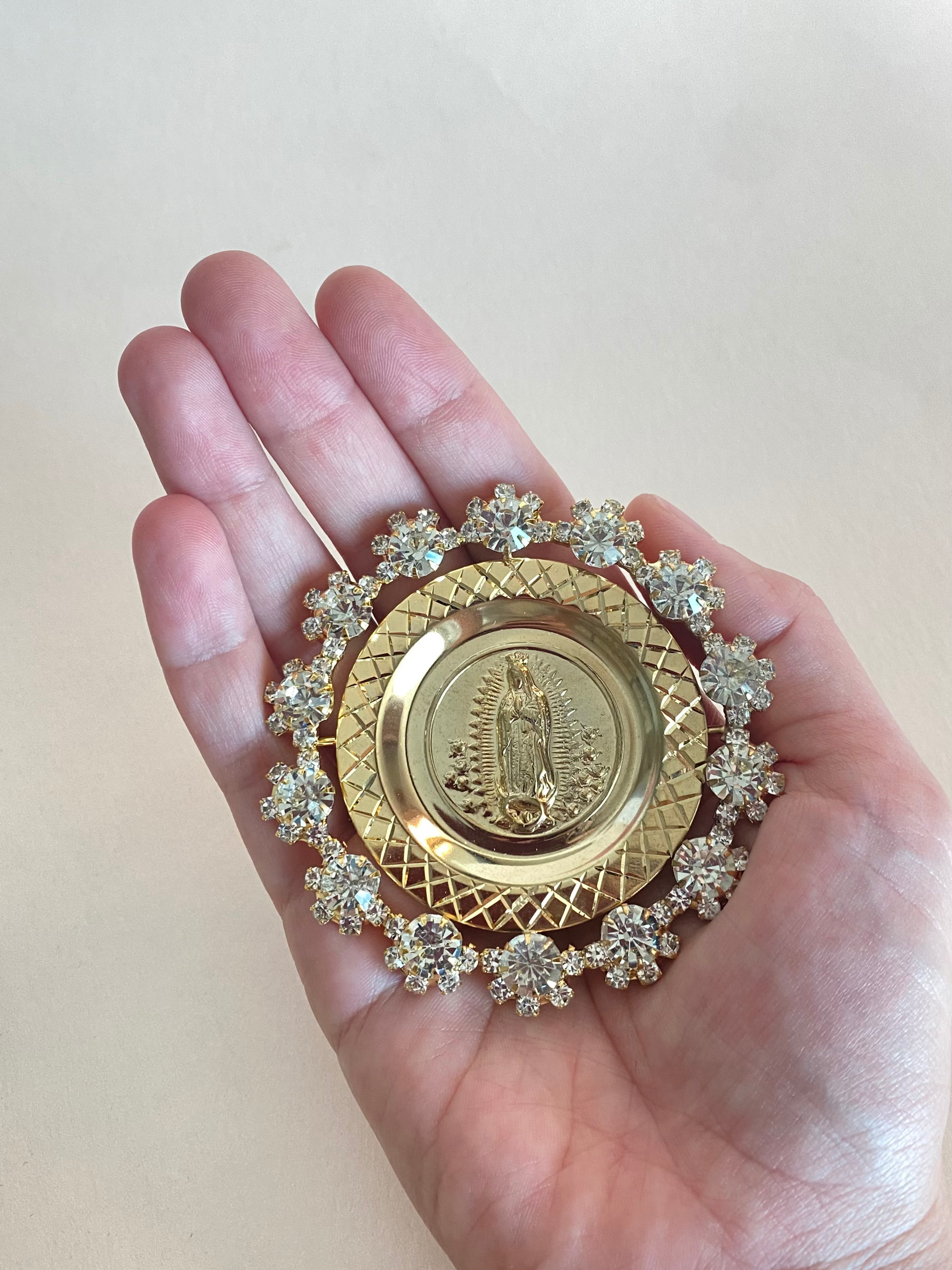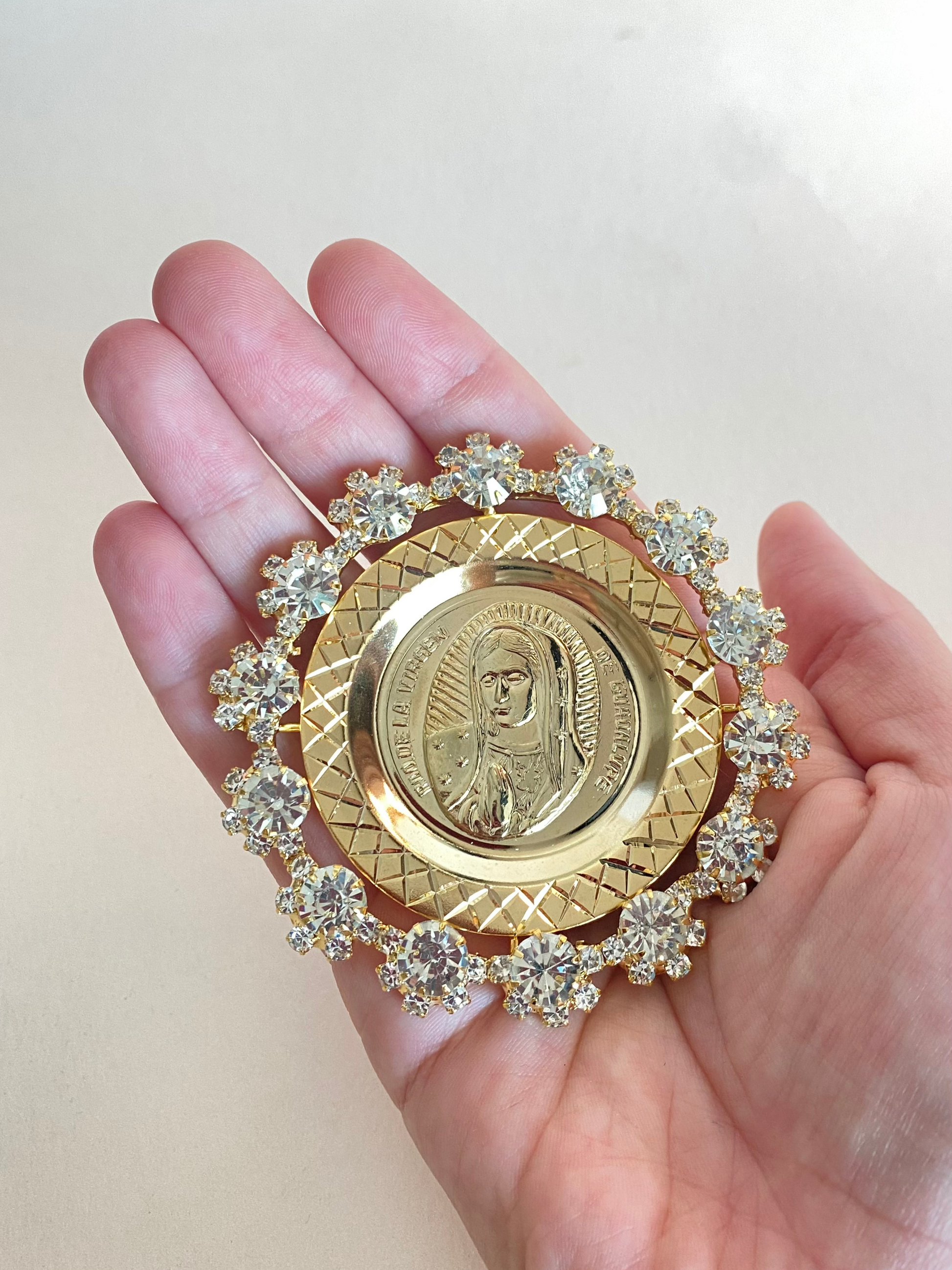 Plato de metal en tono dorado con pedrería en la circunferencia y con imagen grabada de la virgen