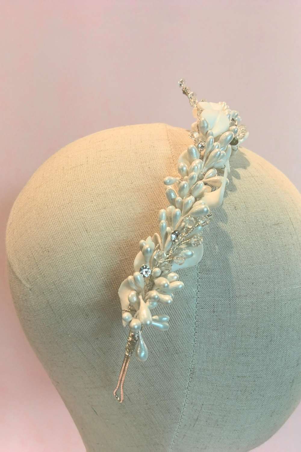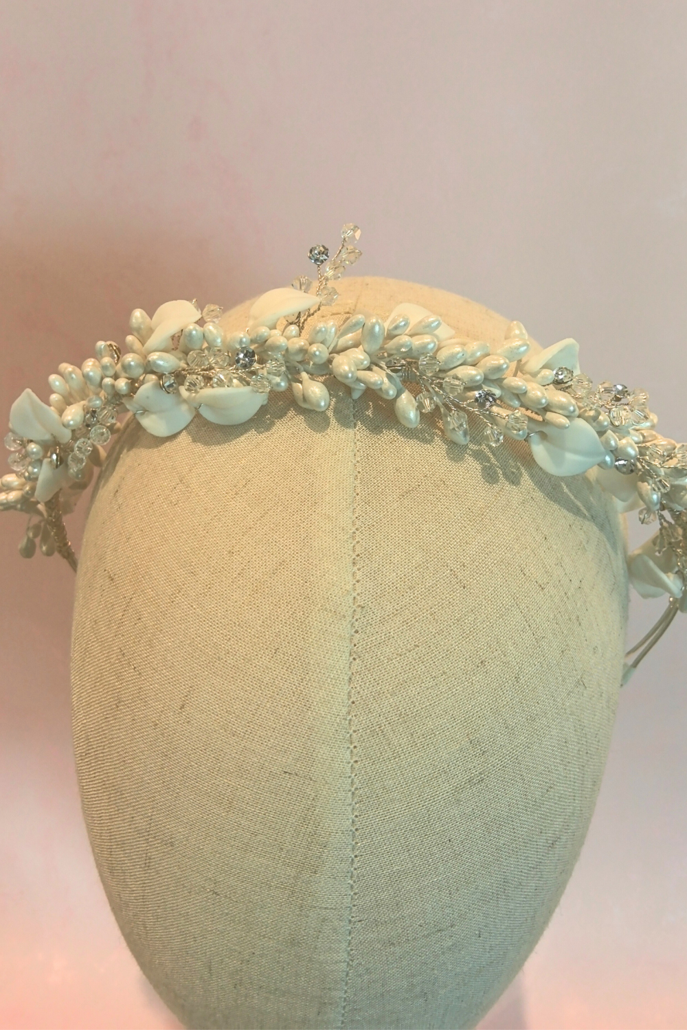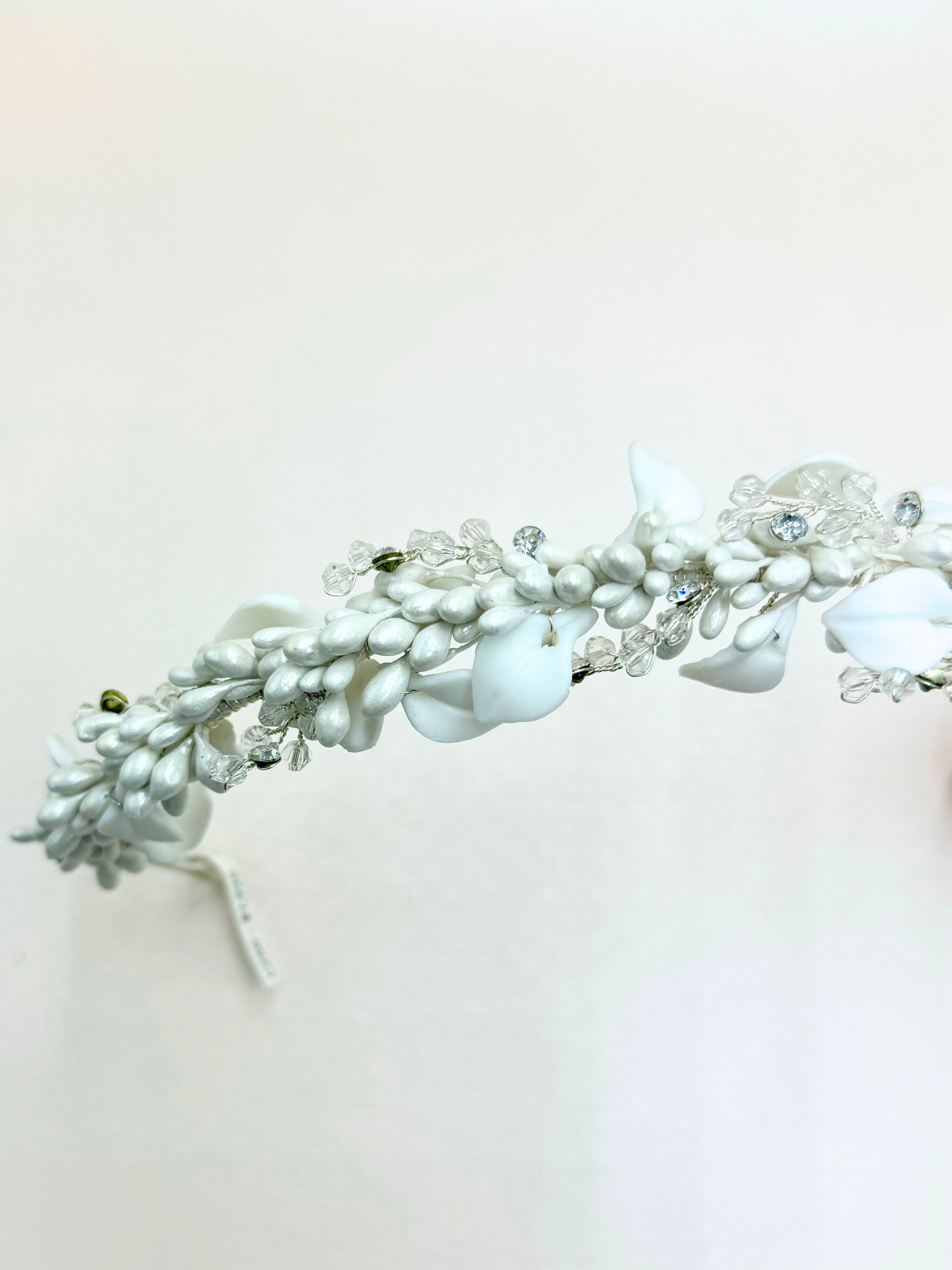 Hermosa tiara de azahares, hojas de pasta blanca y ramaje de cristales transparentes