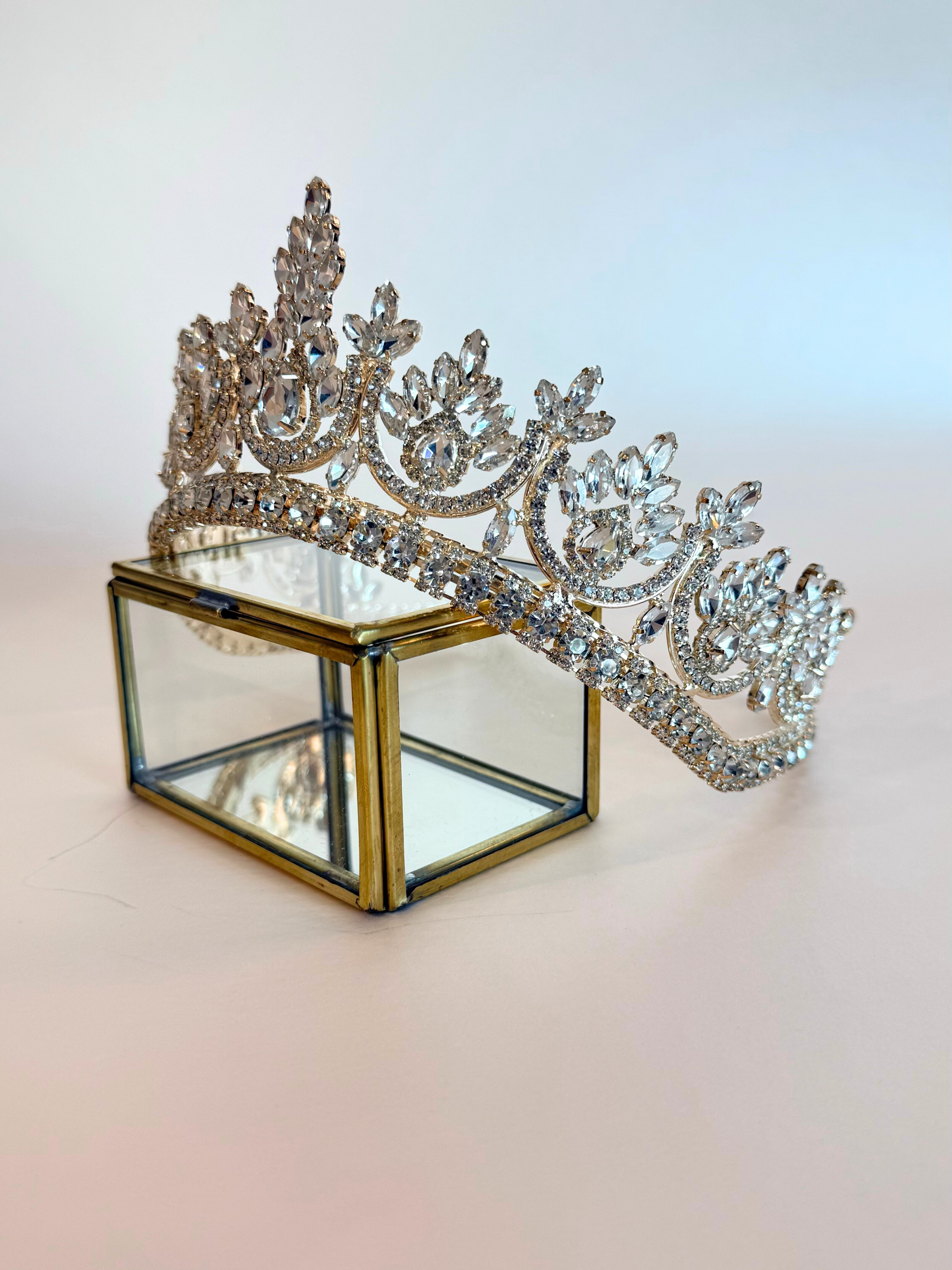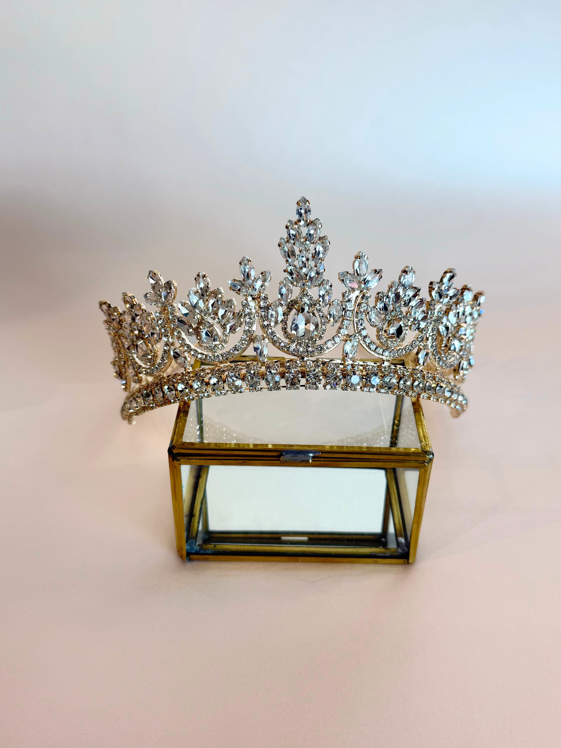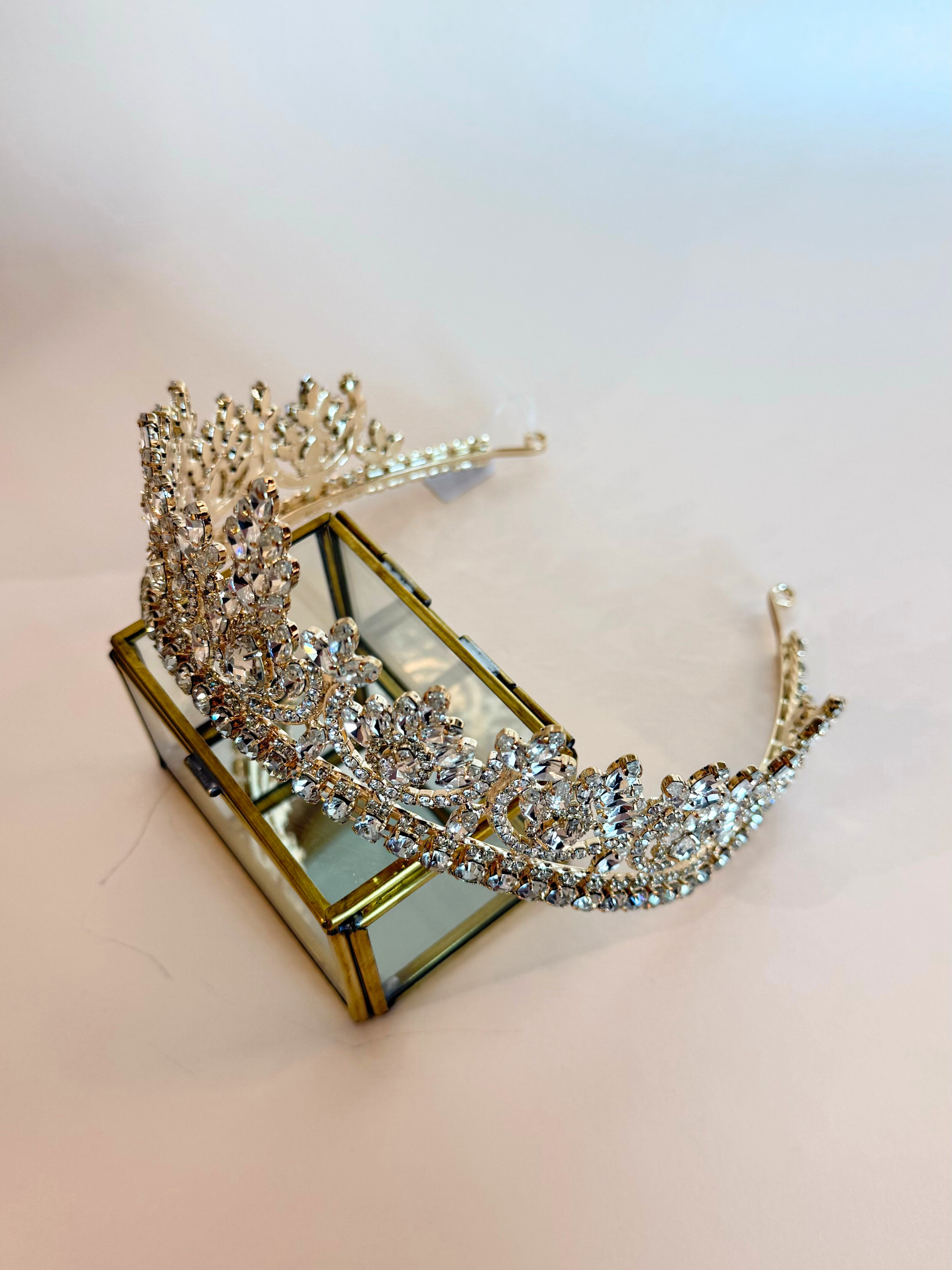 Tiara en base de metal en tono dorado con aplicaciones de pedrería plateadas