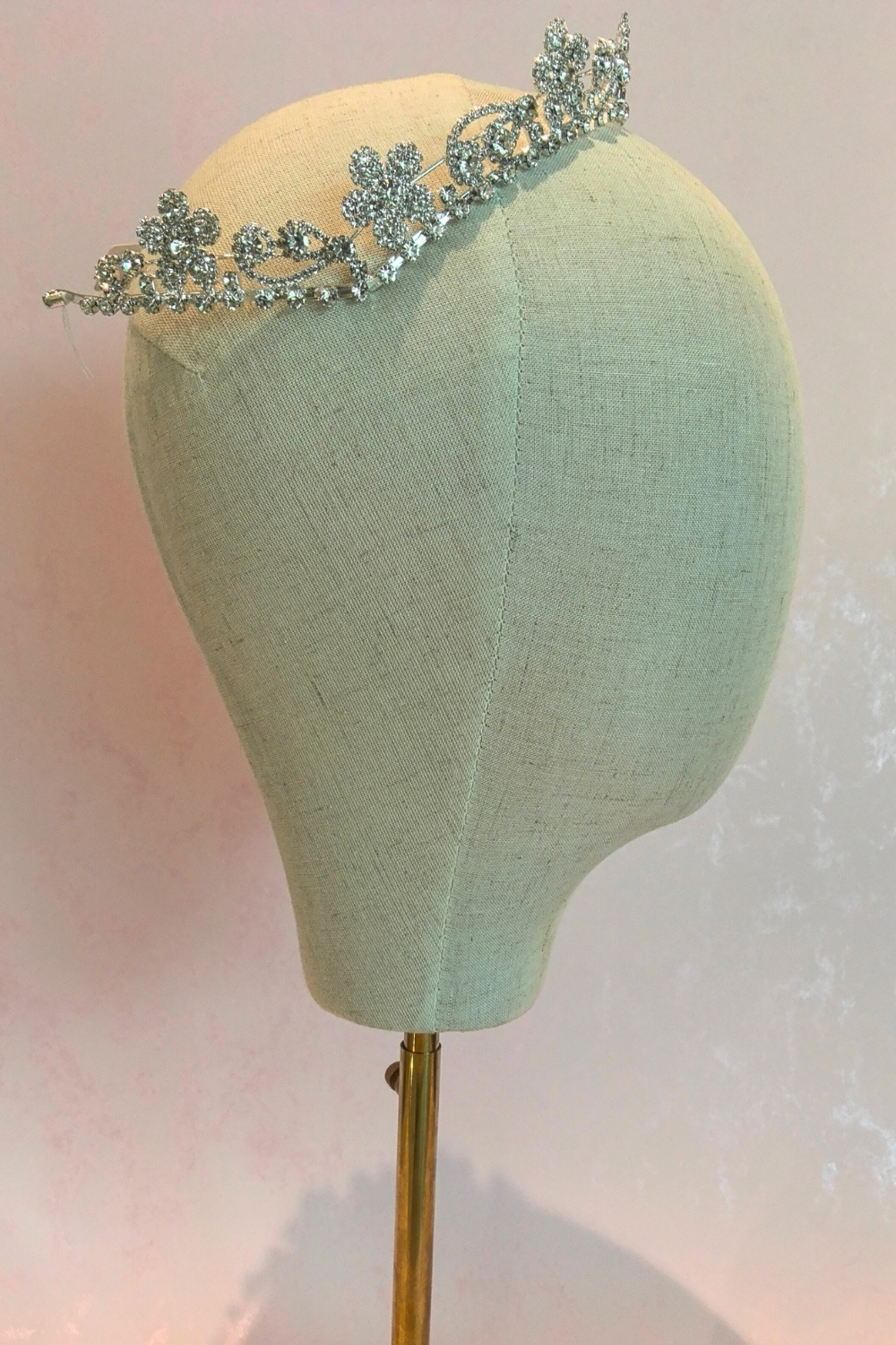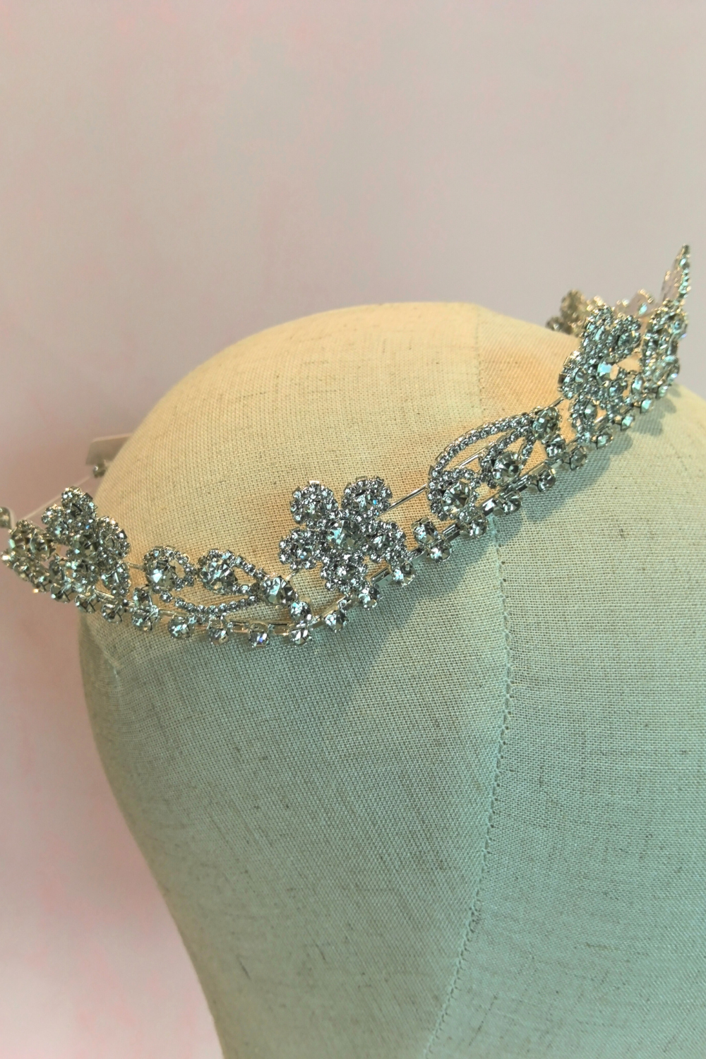 Tiara de metal en tono plata con aplicaciones de pedrería y detalles de hojas