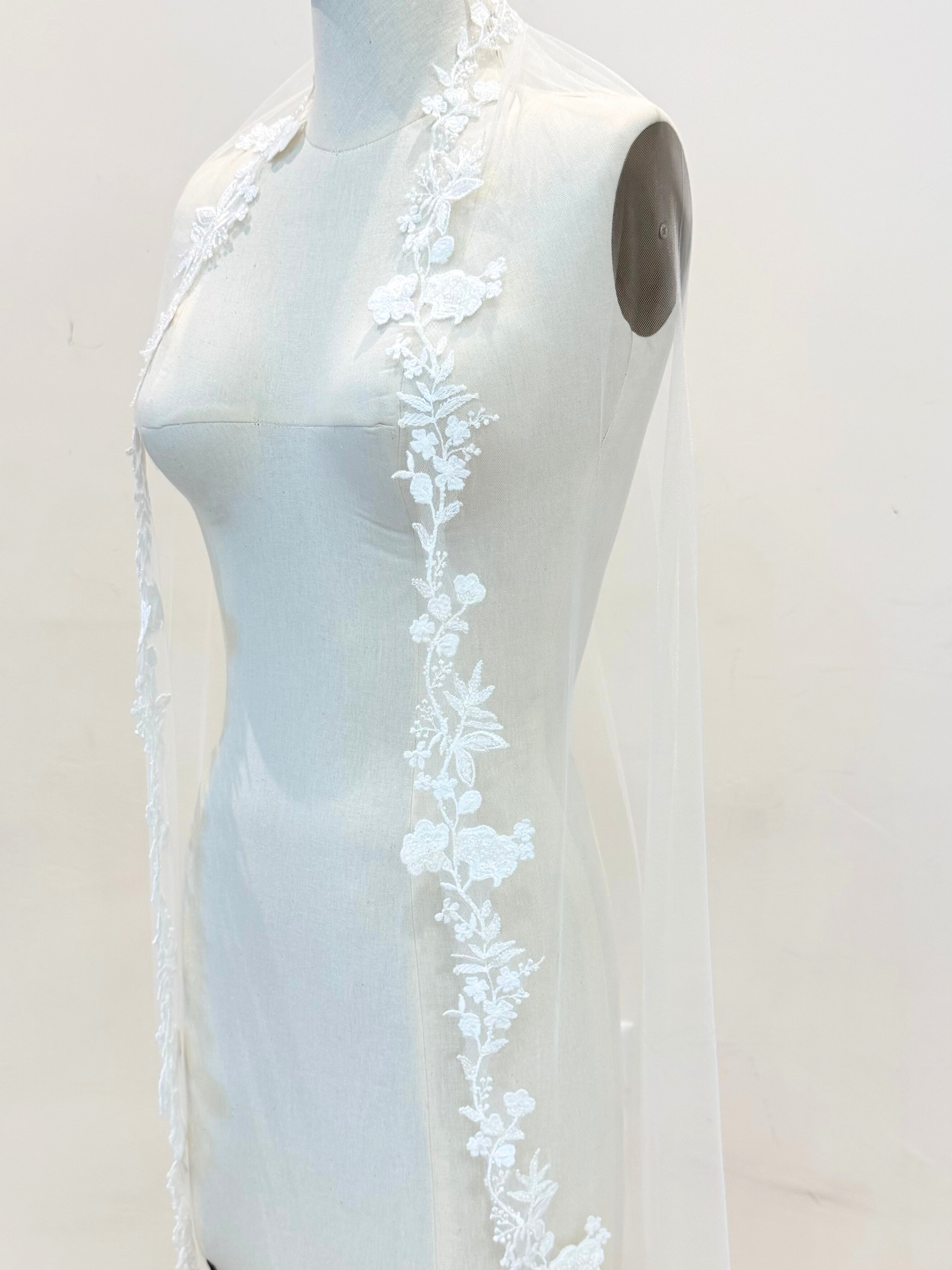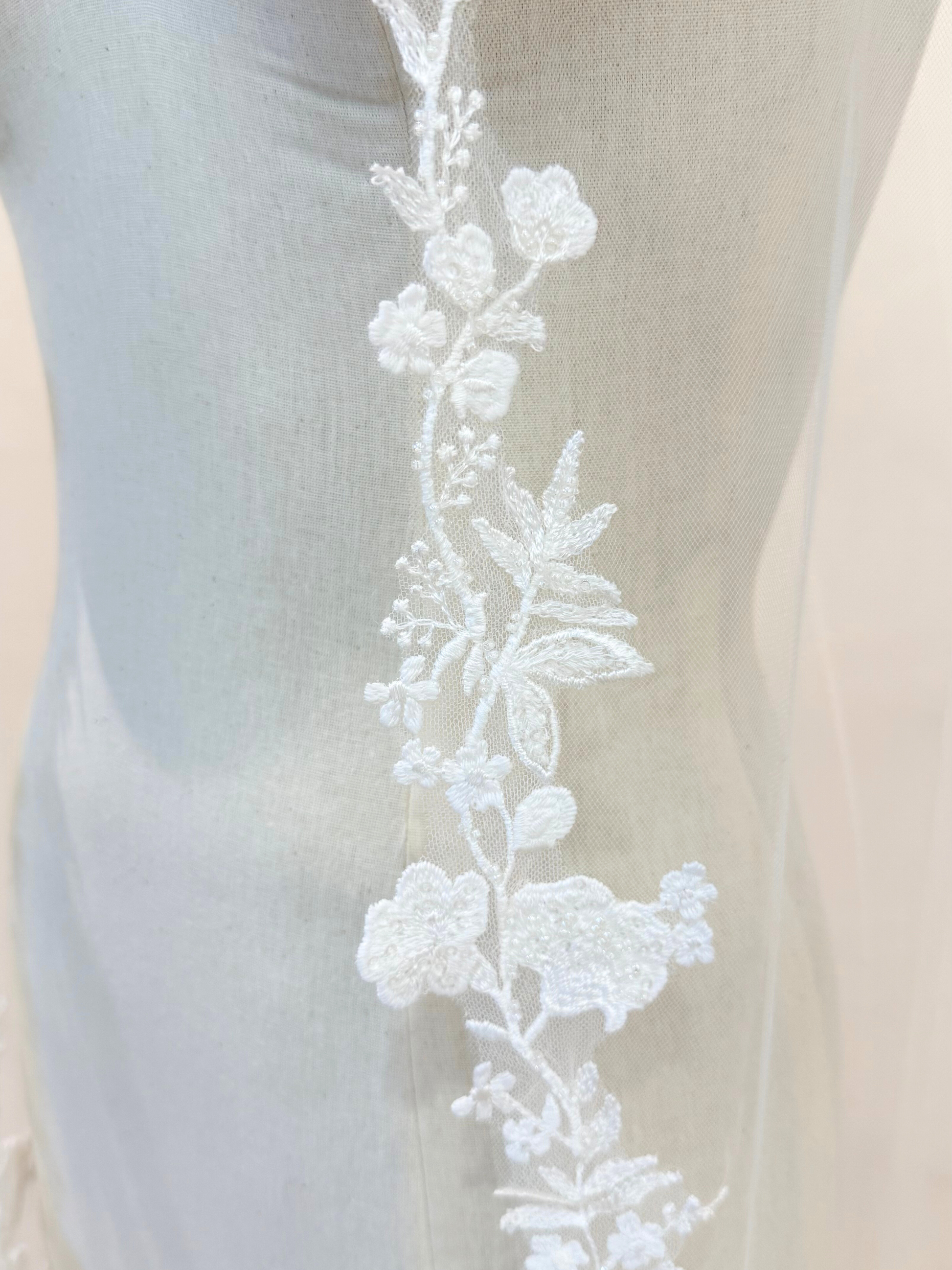 Velo tono ivory con guía de flores con cristales bordados y peineta de metal