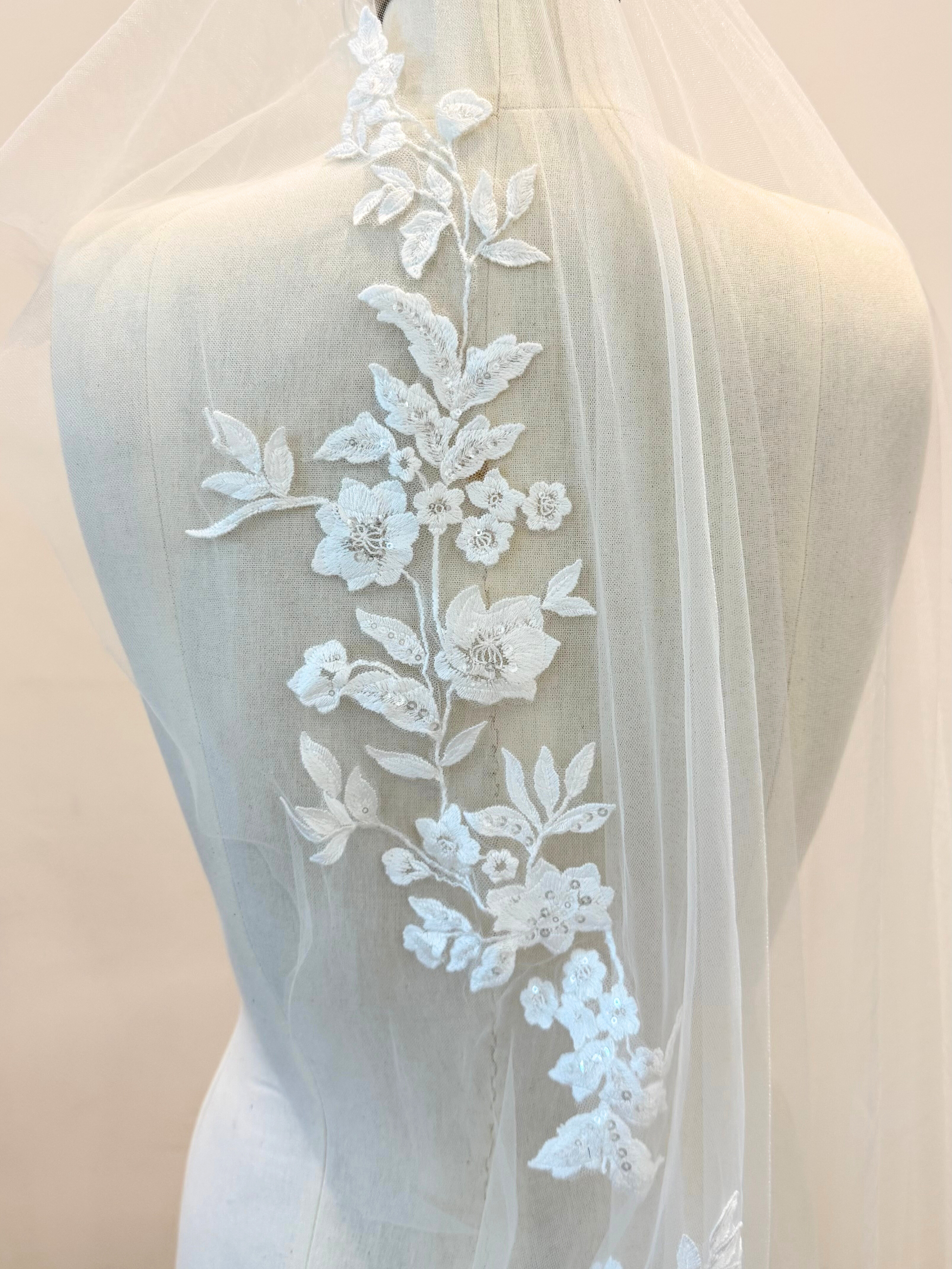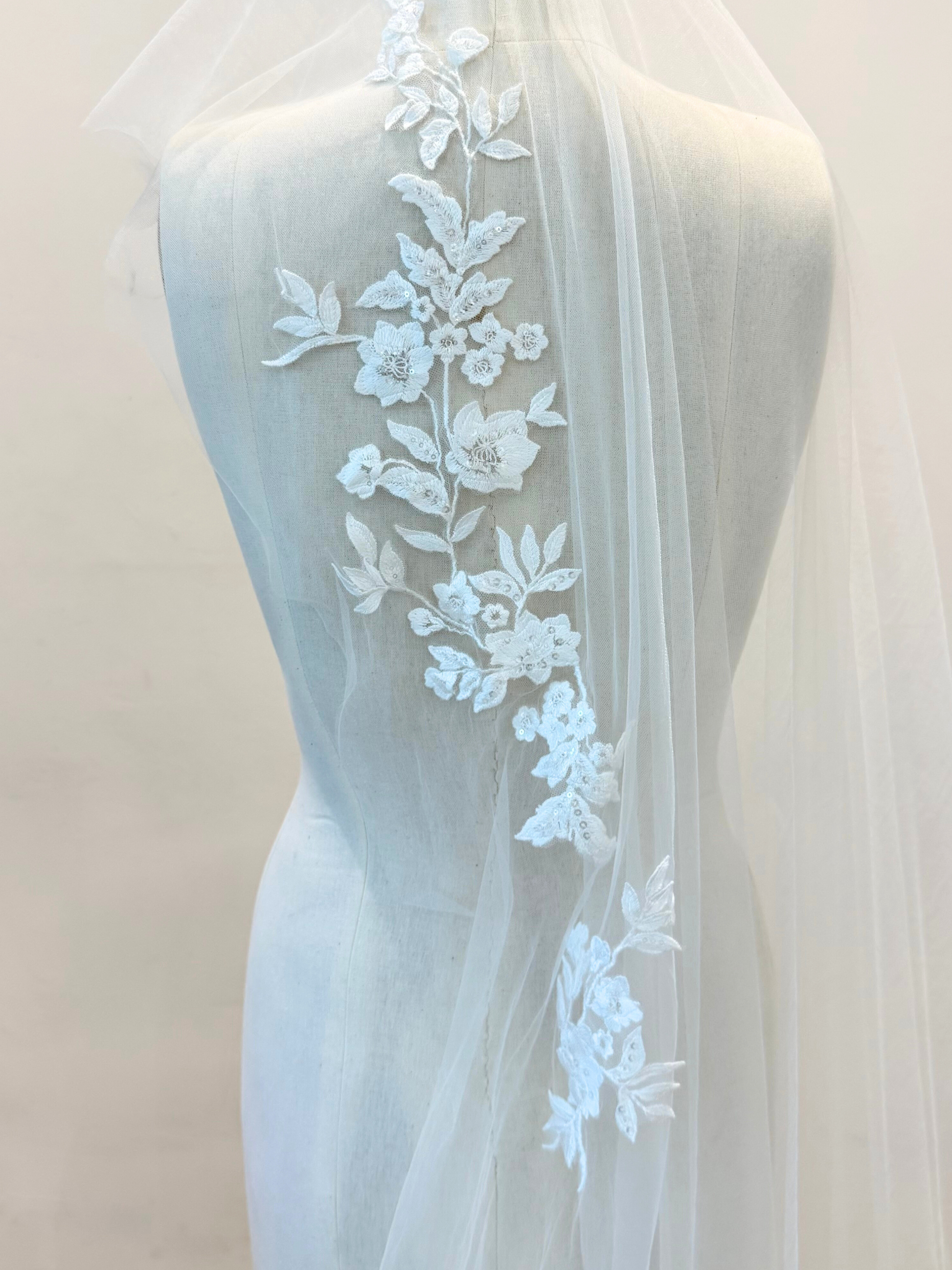 Velo de novia de micro tul con caída suave y peineta de metal, con aplicaciones de flores bordadas en el centro con lentejuelas