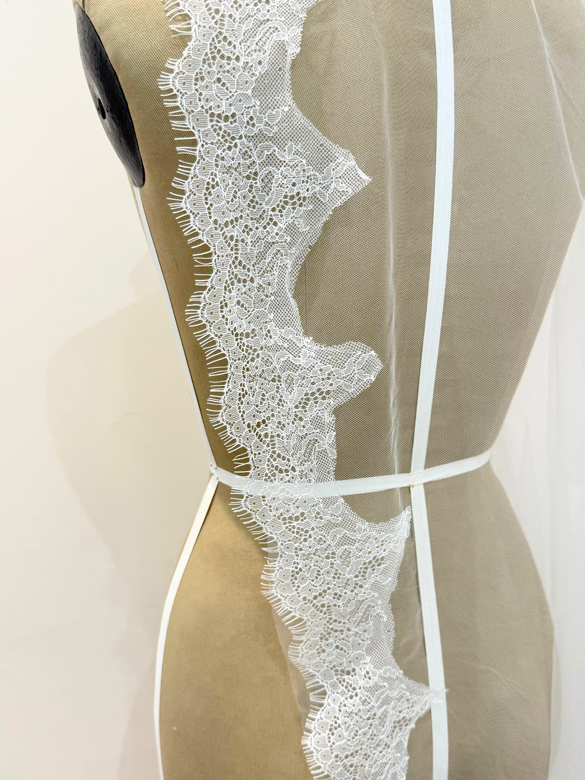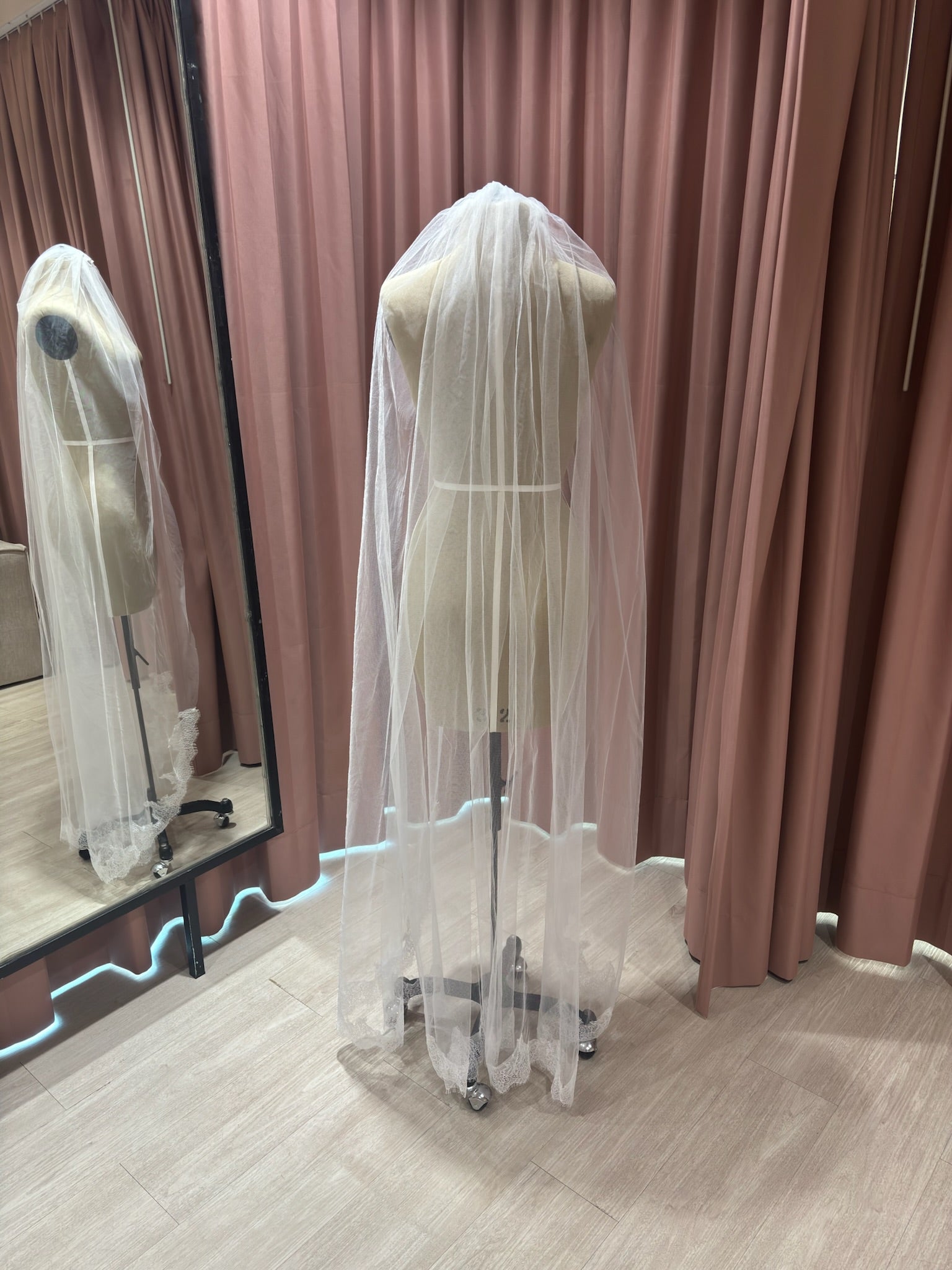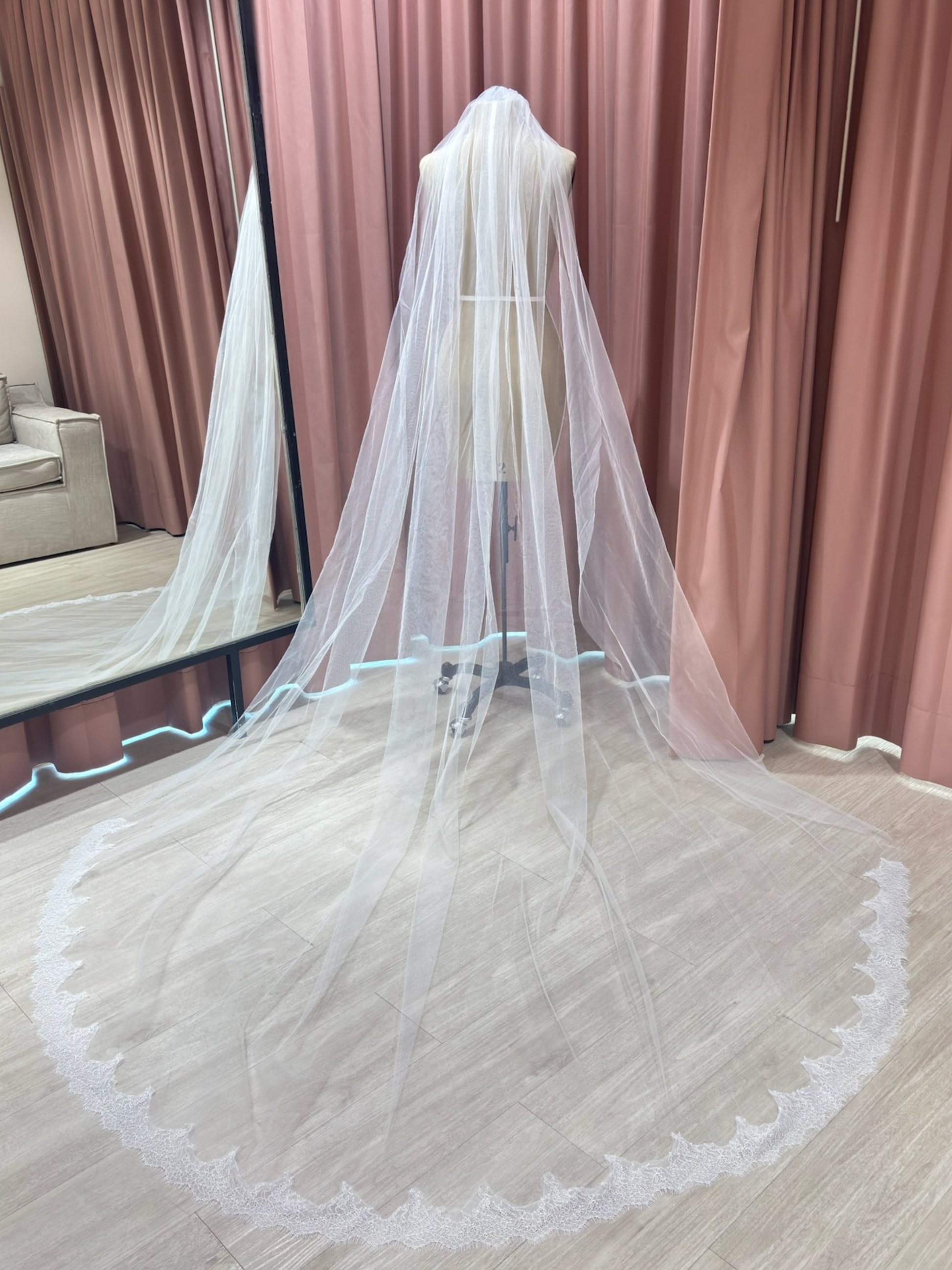 Velo de tul de novia con peineta de metal y orilla bordada de encaje chantilly francés