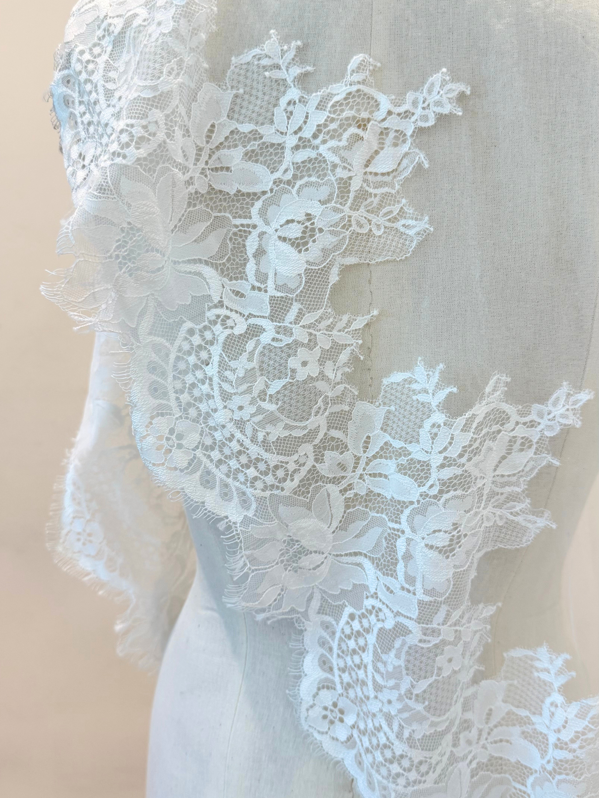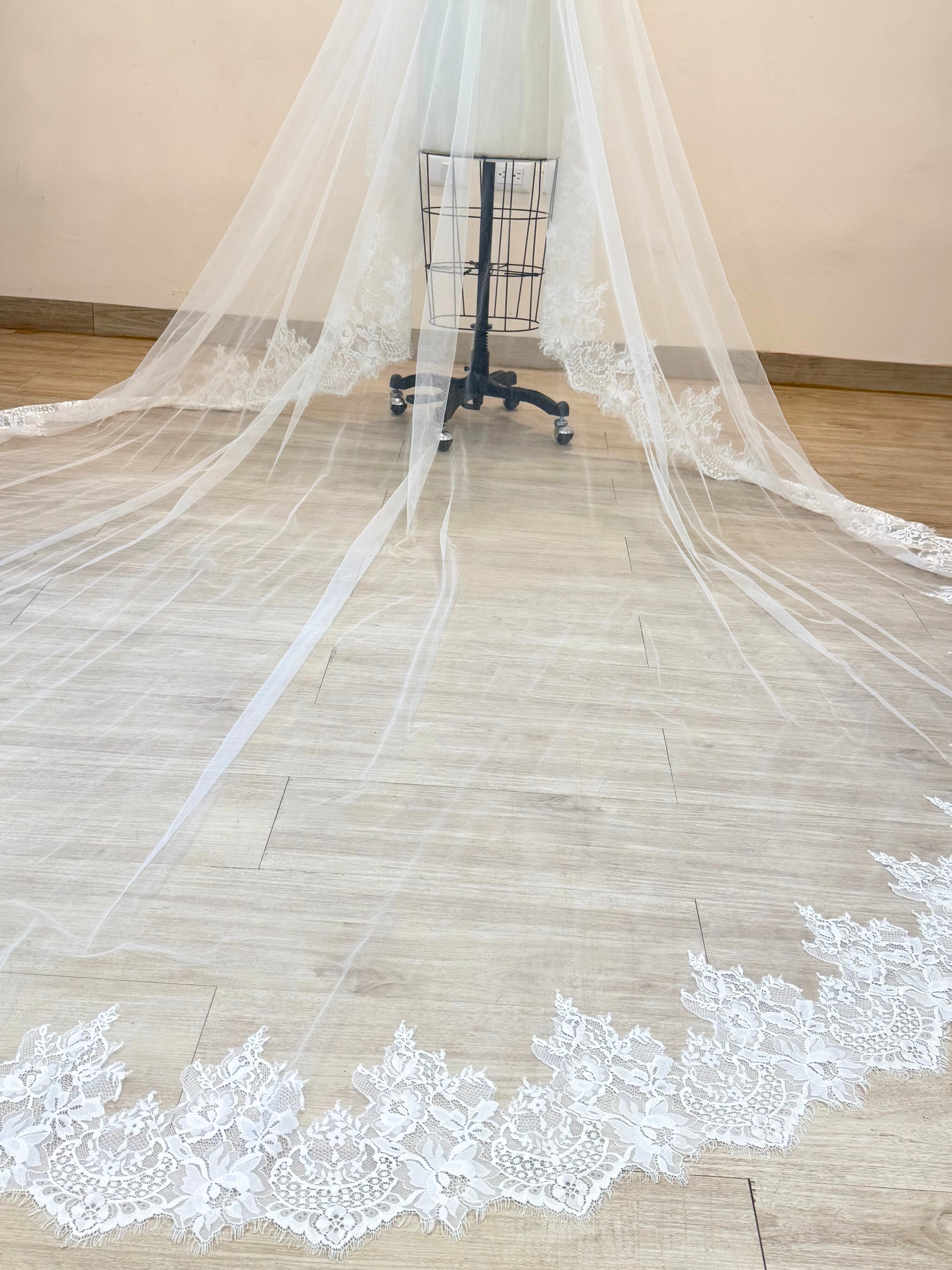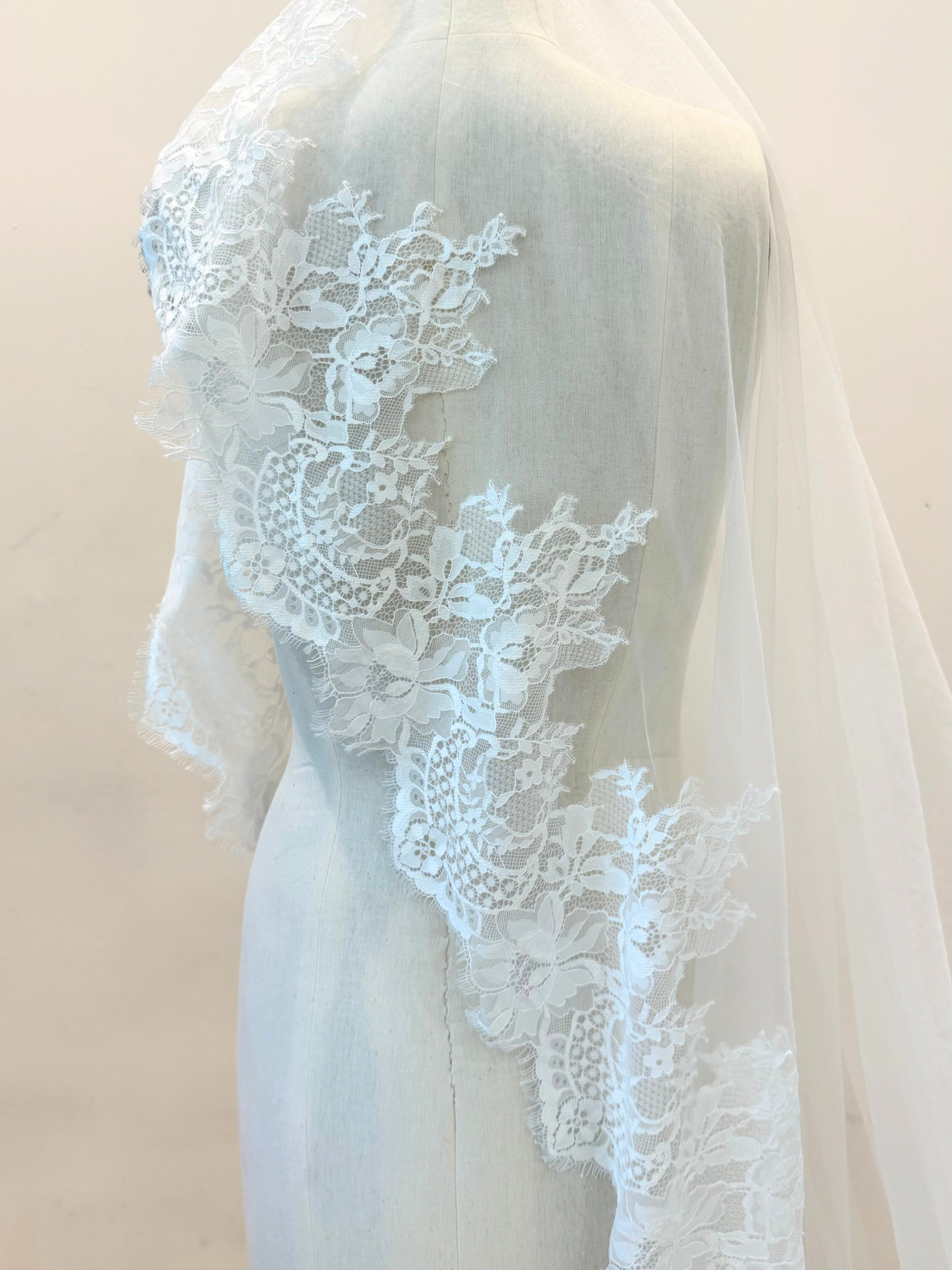 Velo en tono off white con peineta de metal y encaje chantilly bordado en la orilla de todo el velo