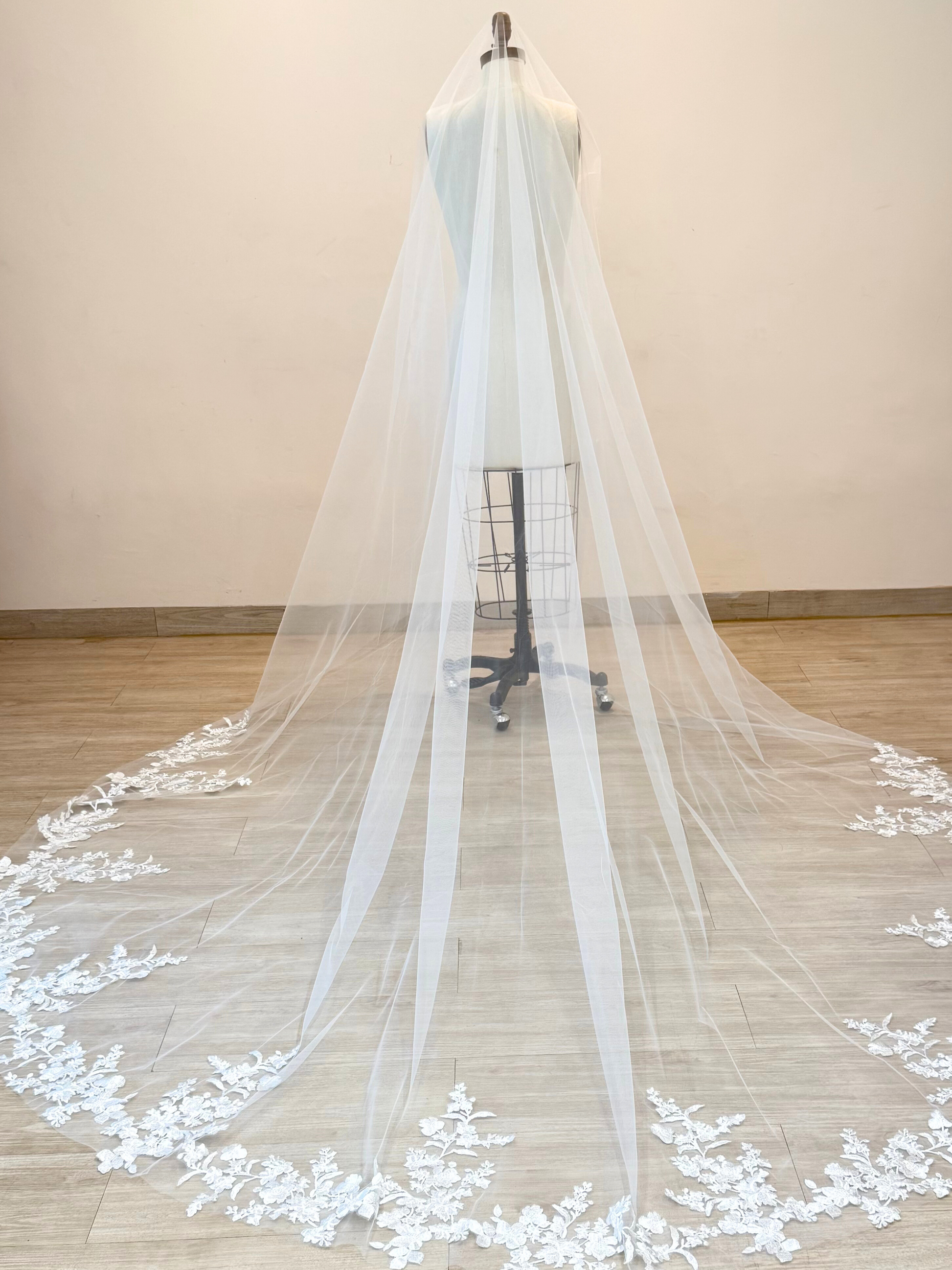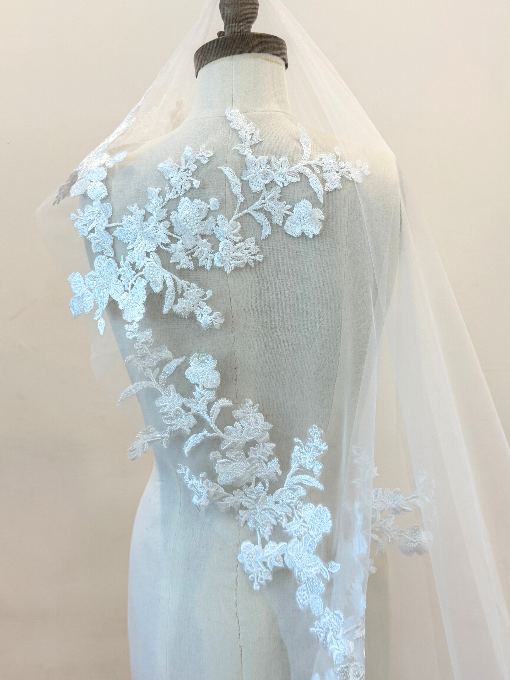 Velo de micro tul tono off white con peineta de metal y encaje bordado en orilla