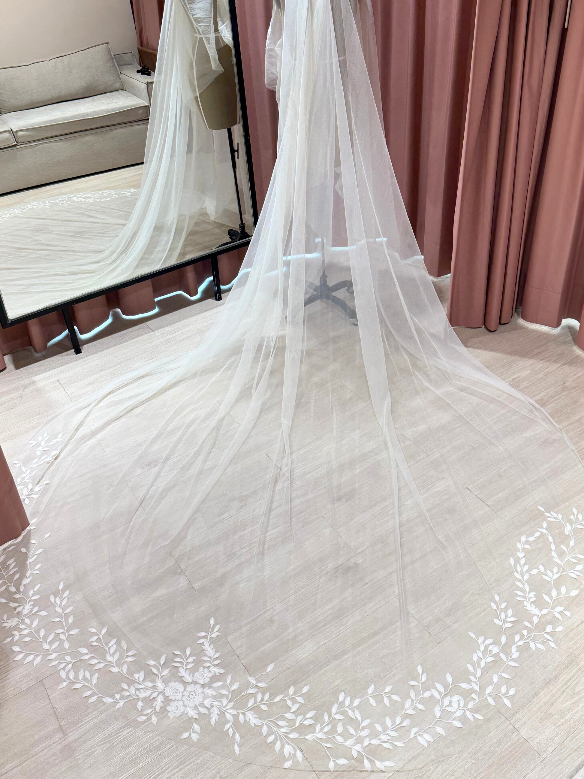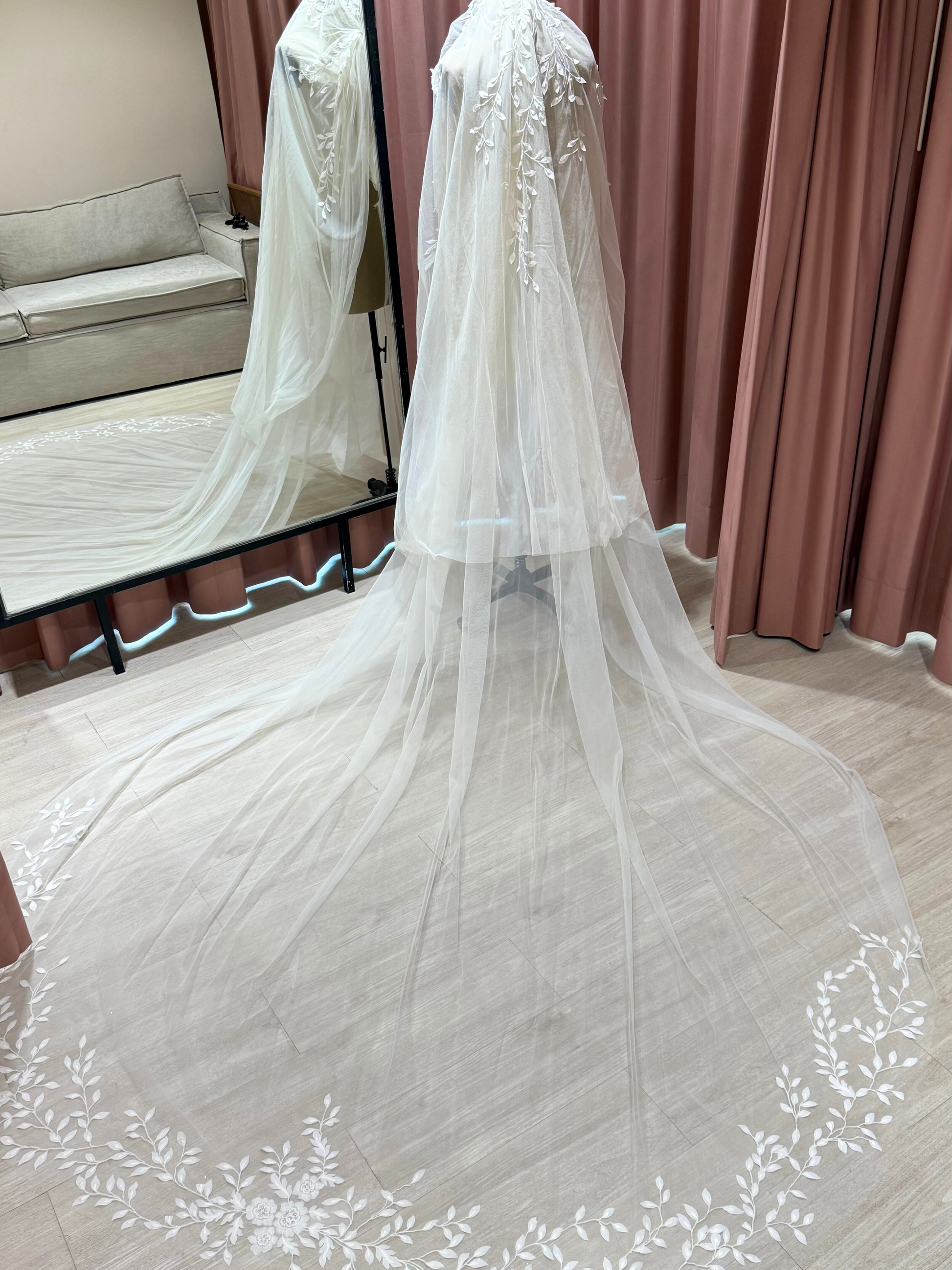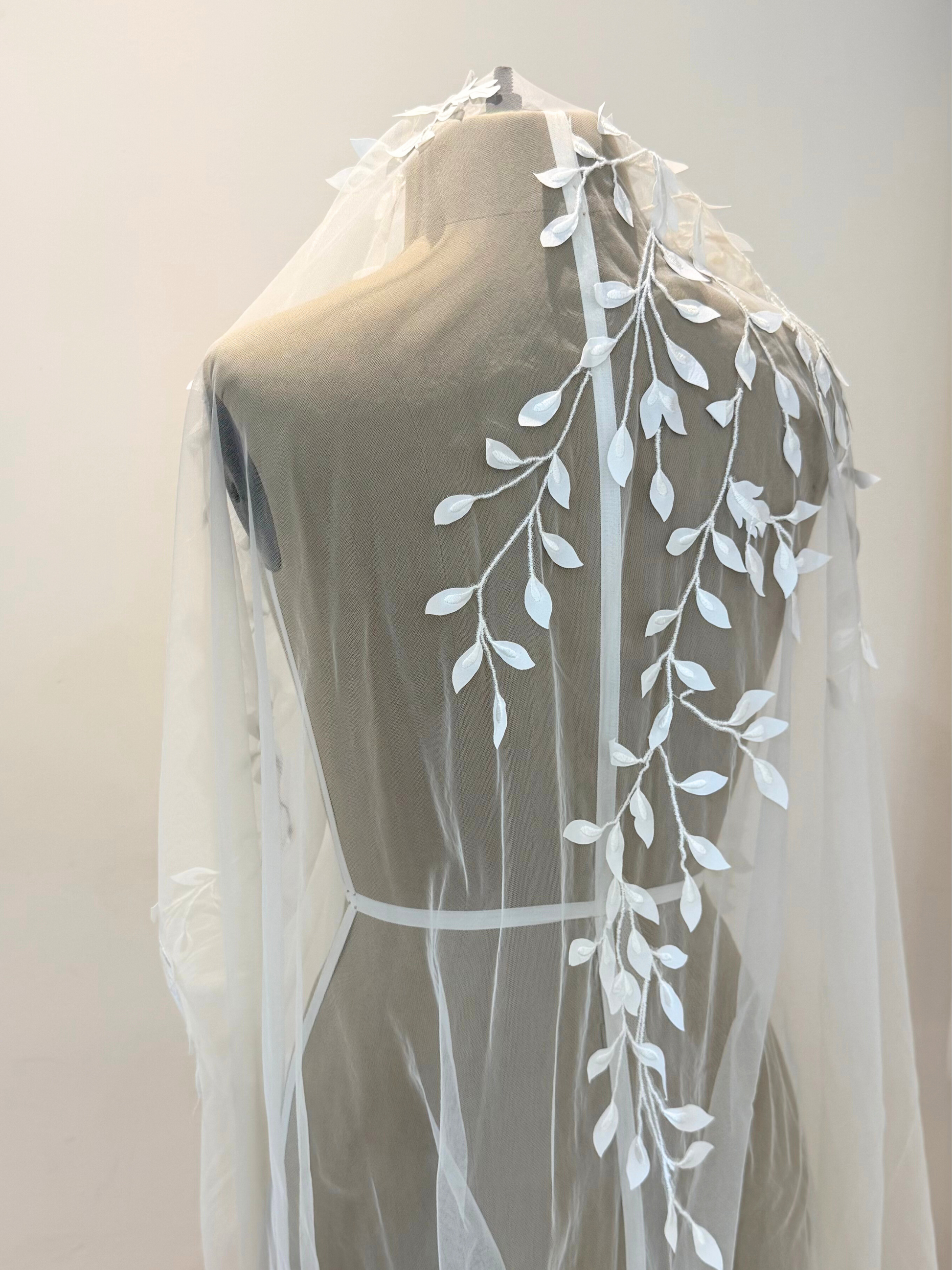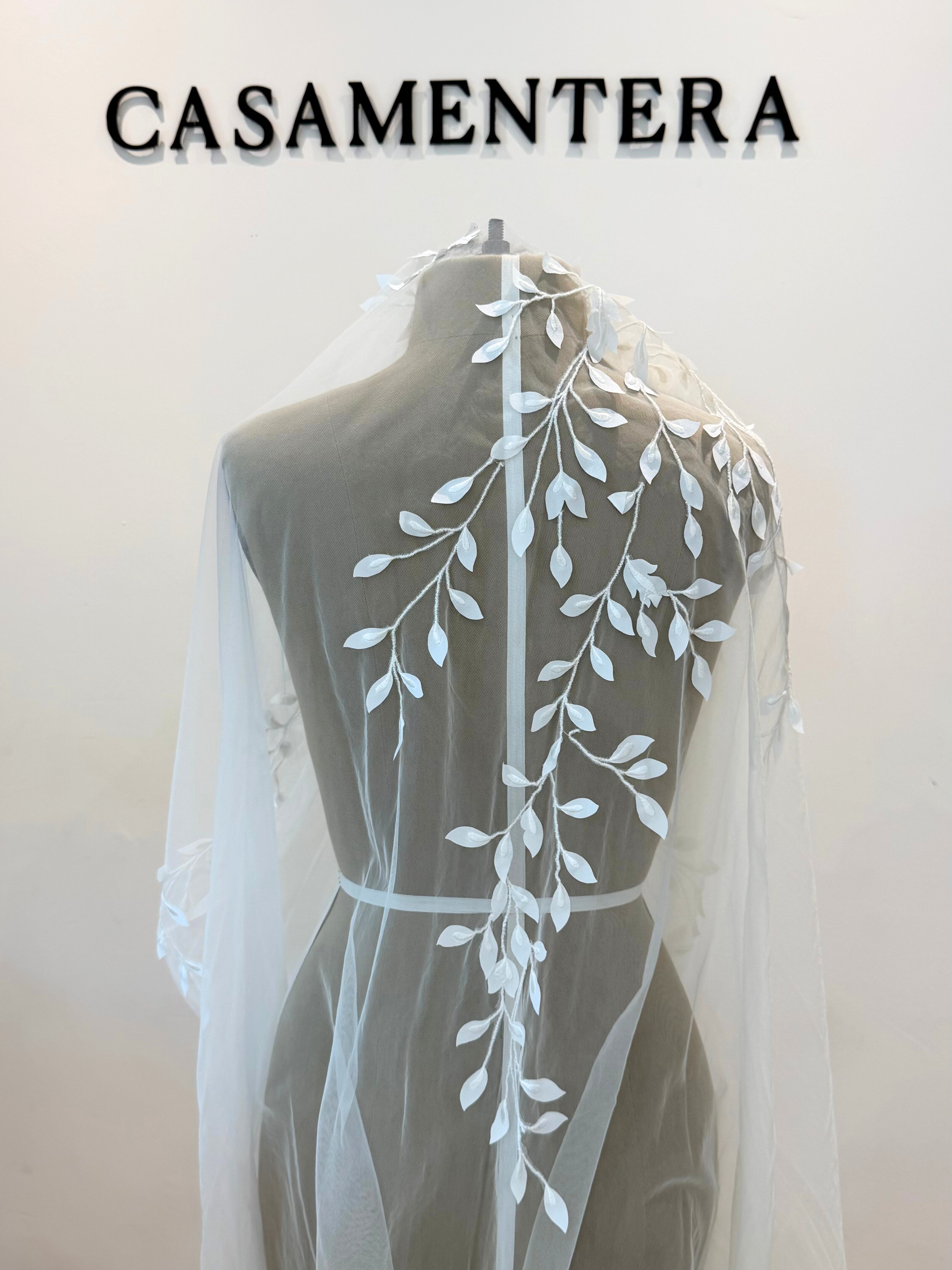 Velo Vero Diaz de doble capa (desmontable) tono ivory, con aplicaciones de hojas , con hojales.