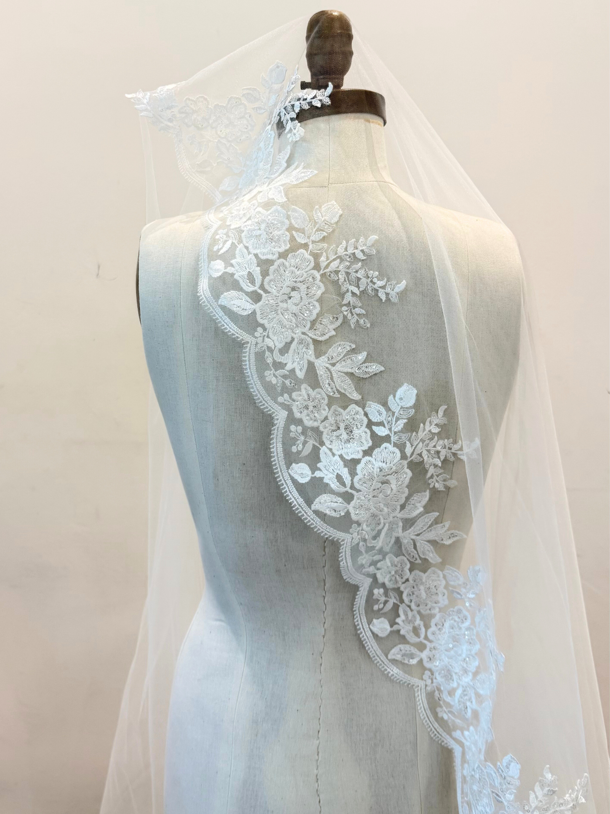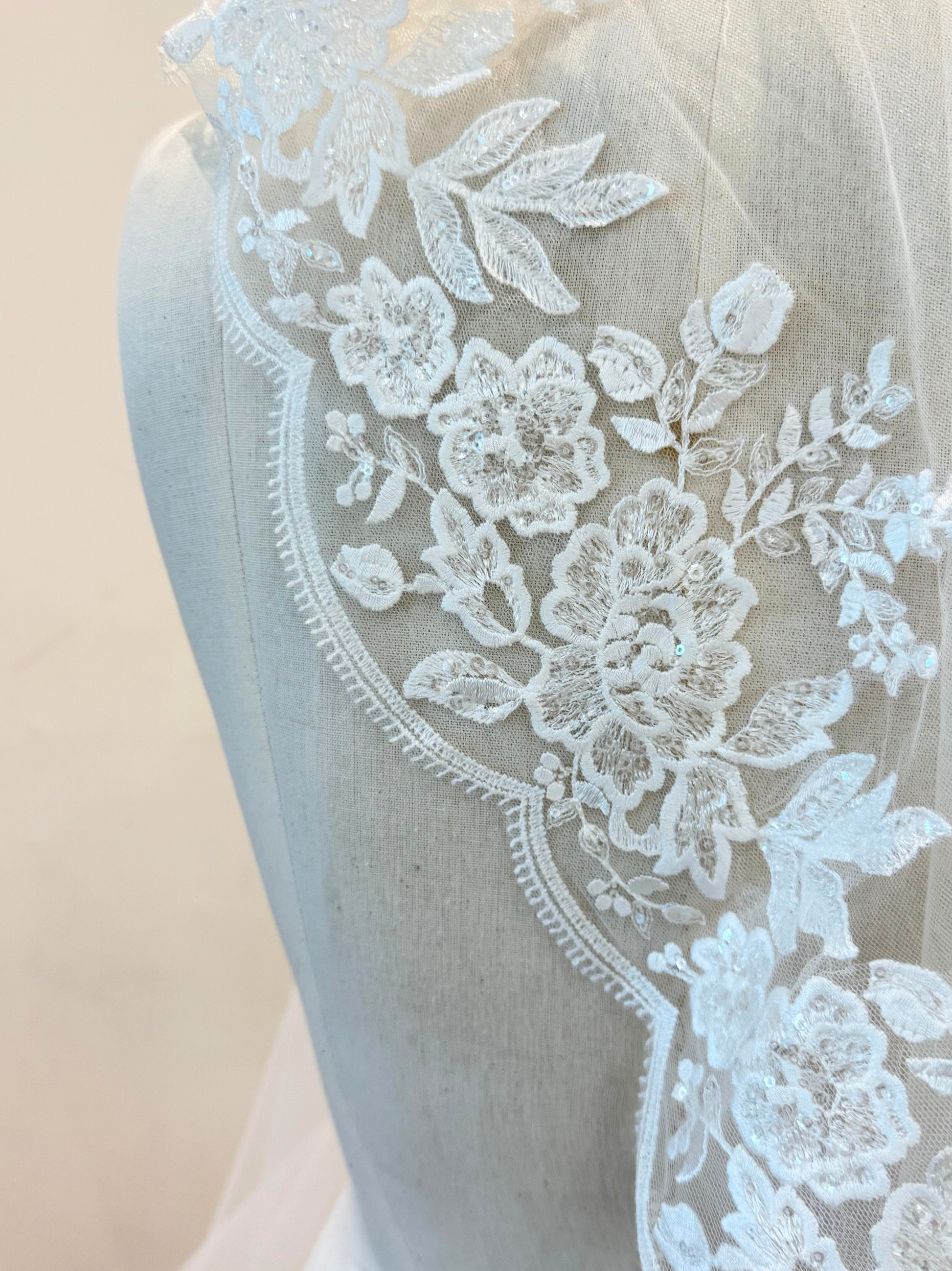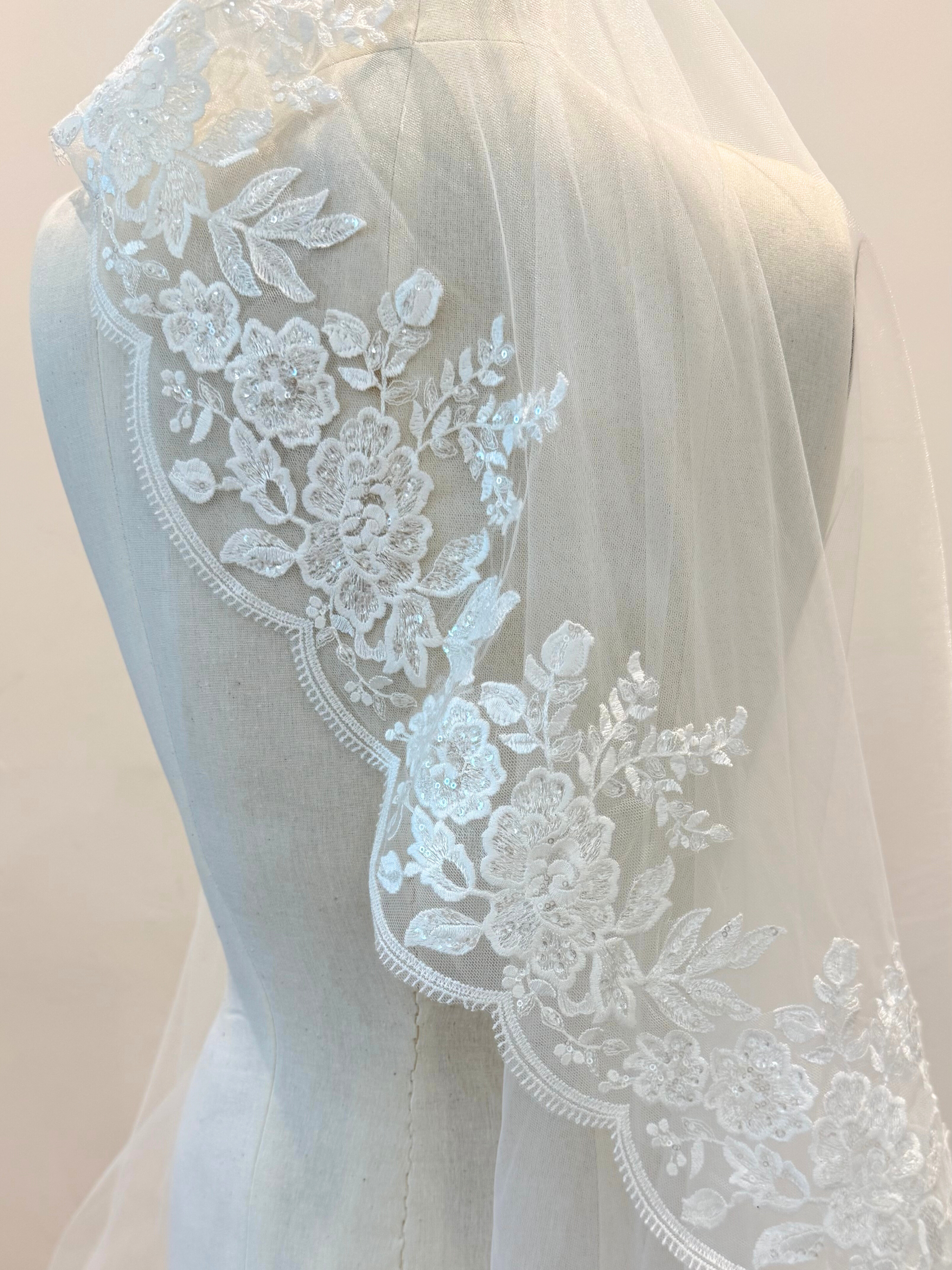 Velo de tul con peineta de metal y orilla de encaje con lentejuelas transparentes bordadas en media cenefa