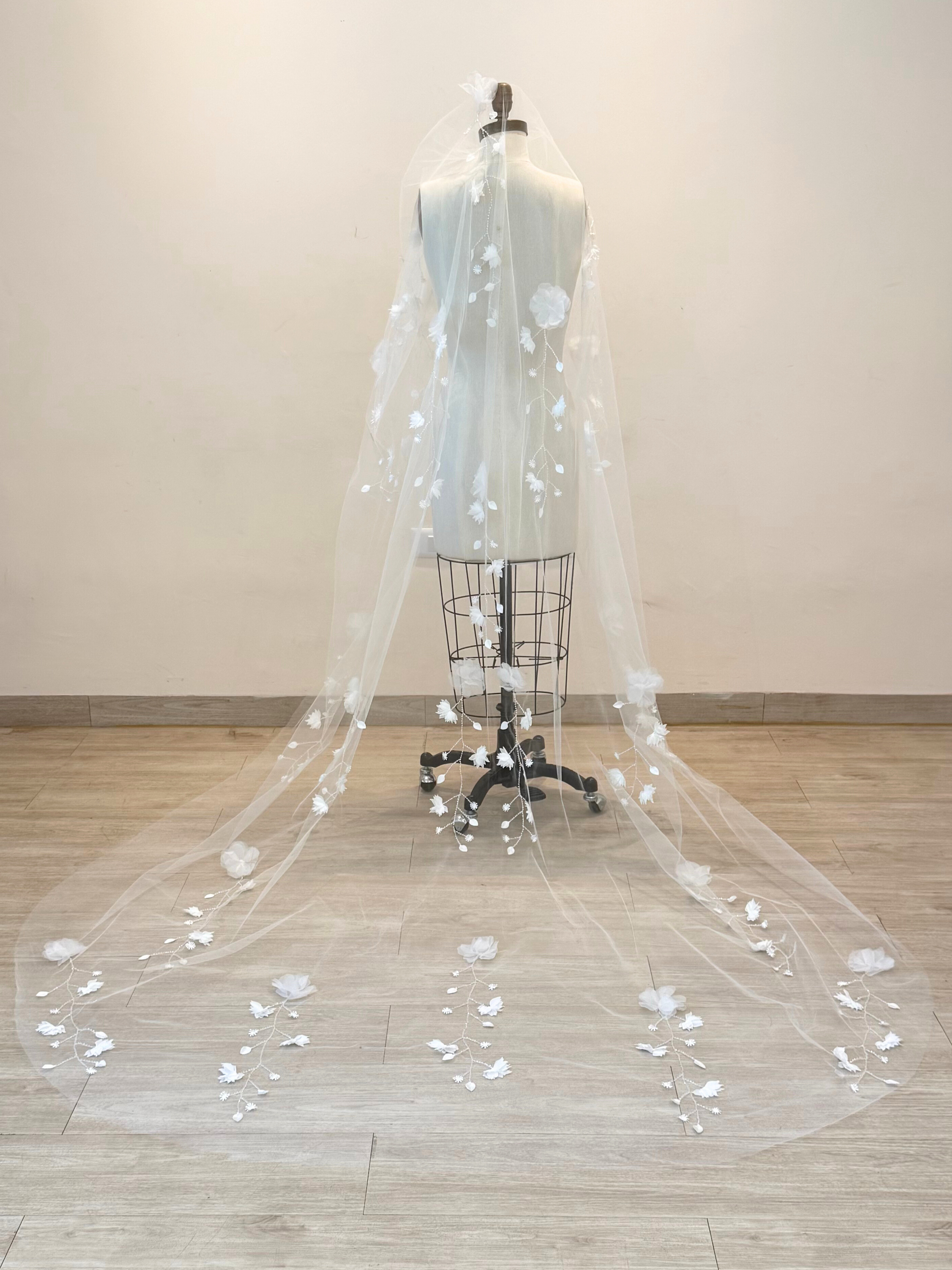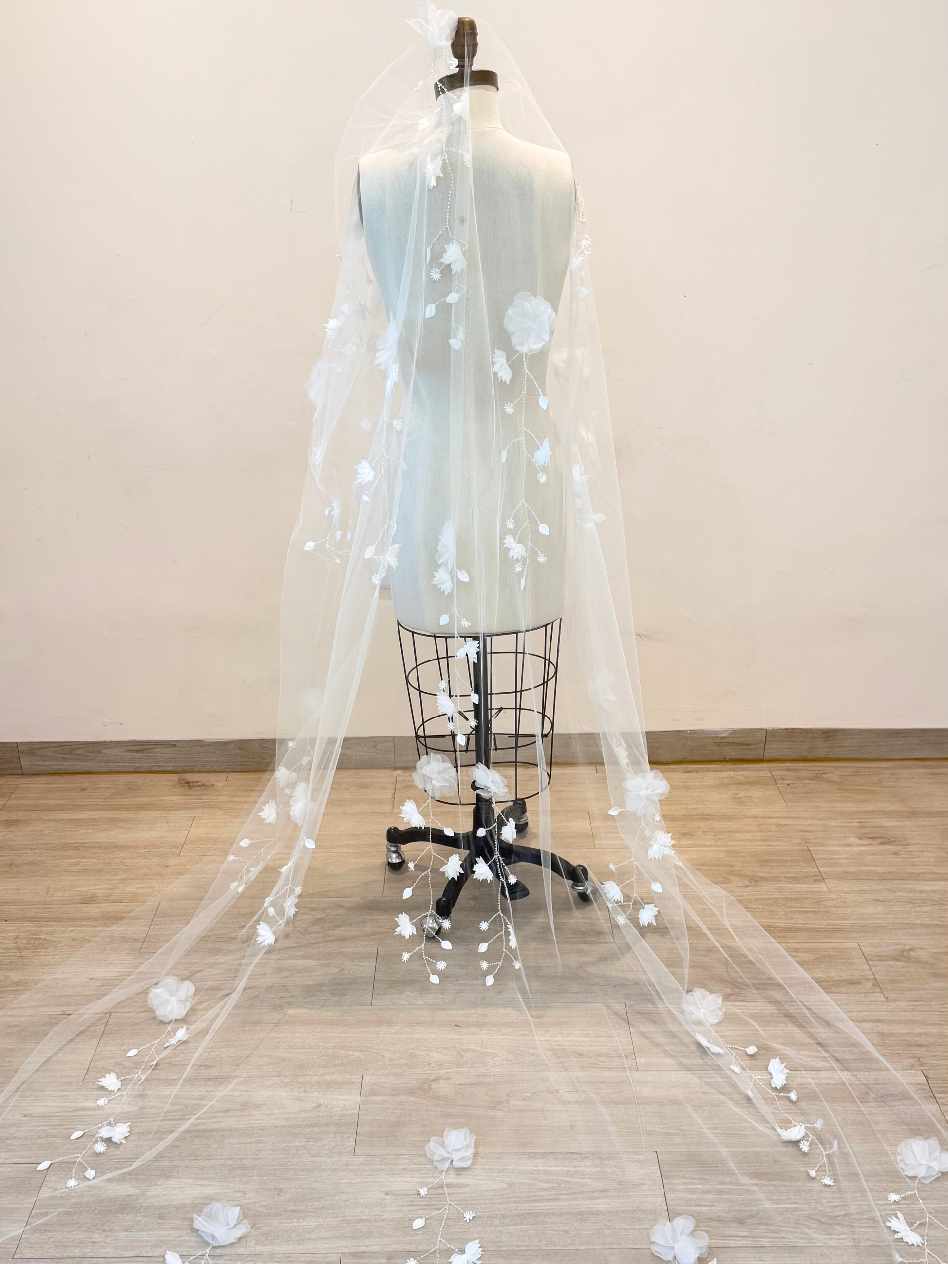 Velo de novia con peineta de metal en tono ivory , con aplicaciones 3D de flores y cristales