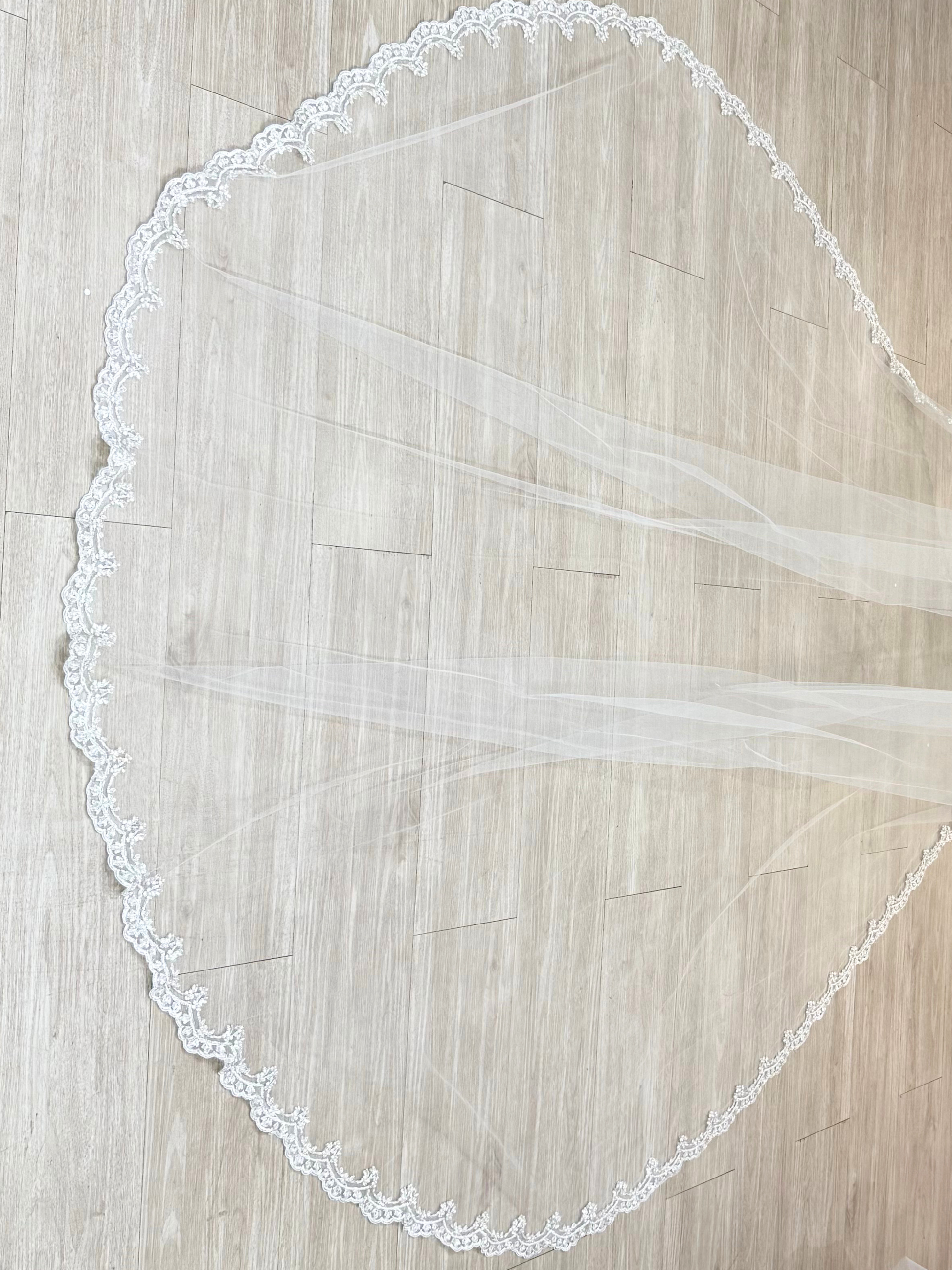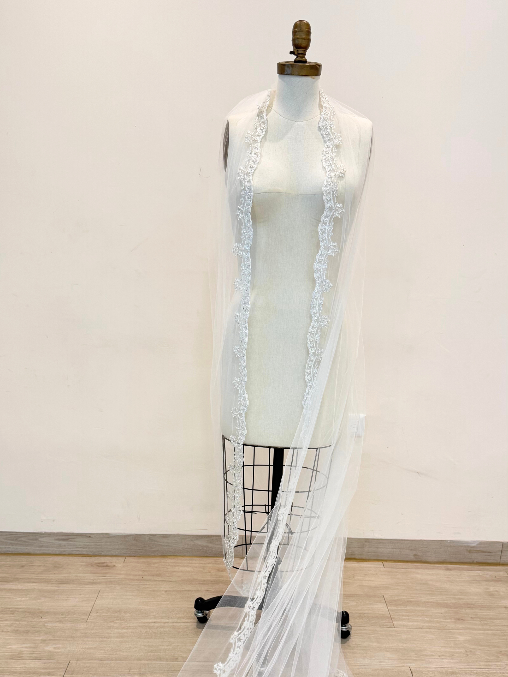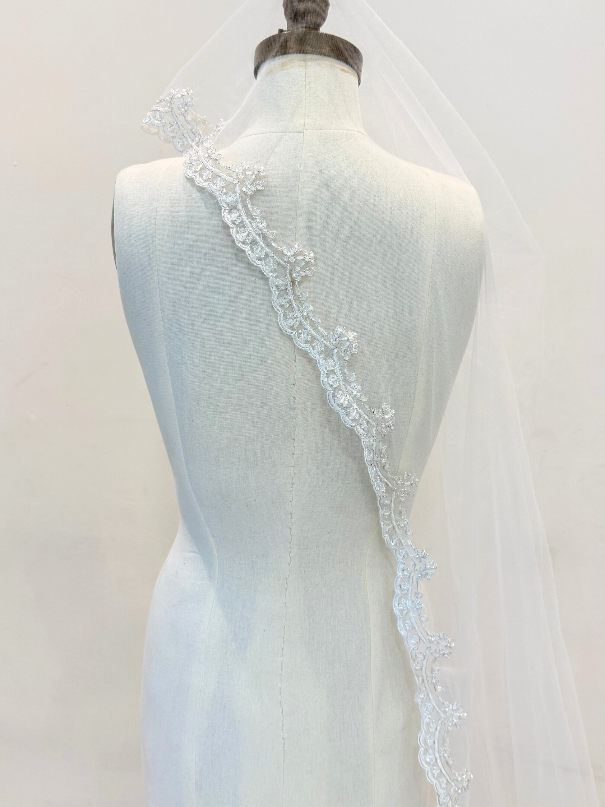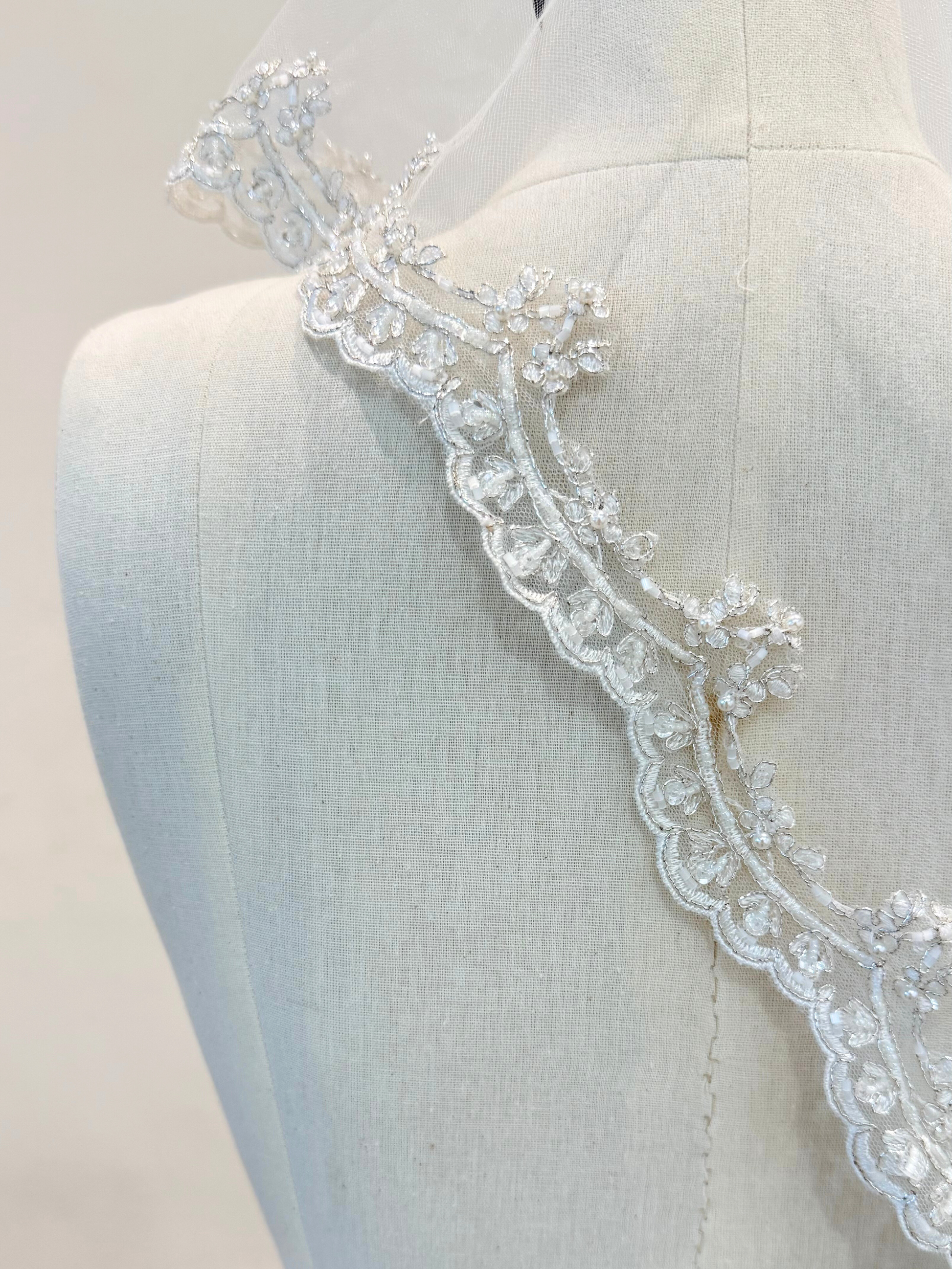 Velo en tul de novia con orilla de encaje delgada con cristales bordados.