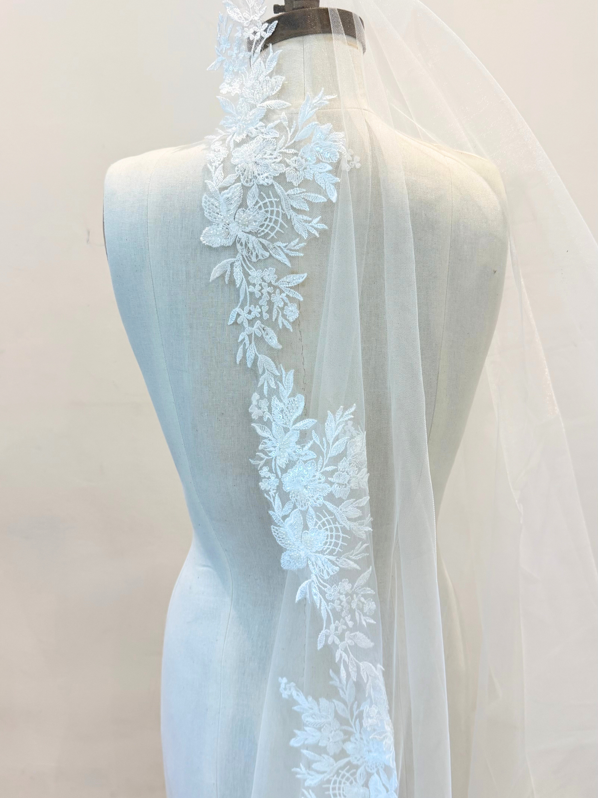 Velo novia con peineta de metal y orilla de encaje bordado con pequeños cristales