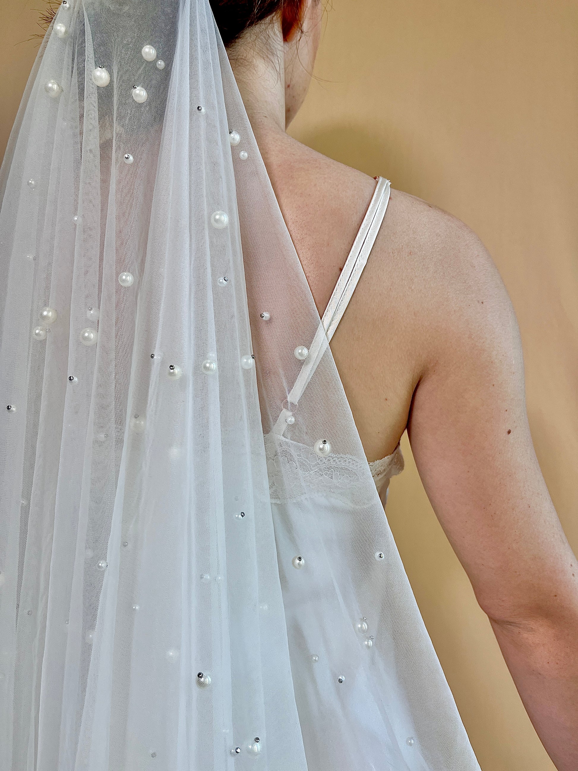 Velo de microtul doble capa, con perlas bordadas, tono ivory, peineta de metal.