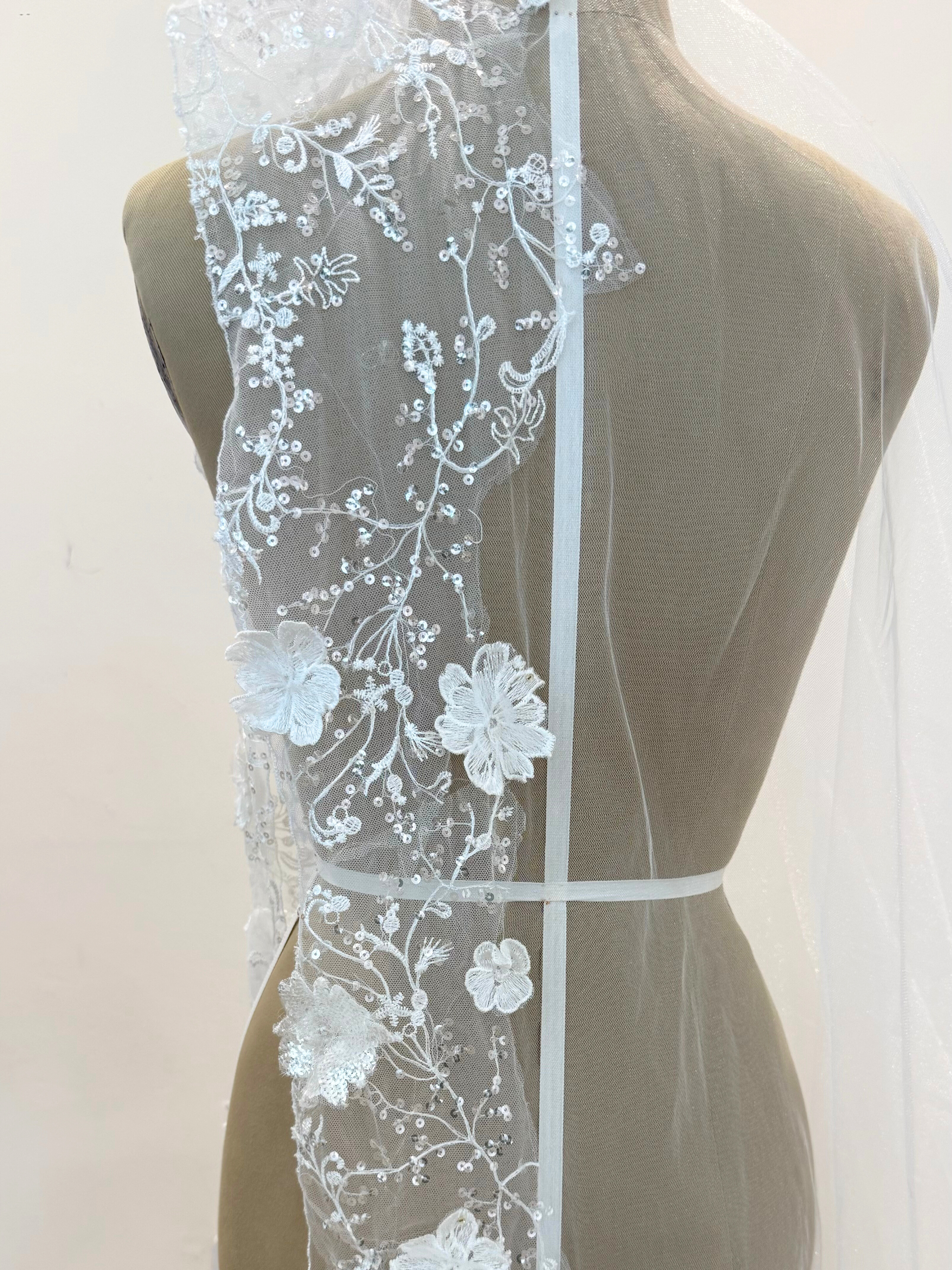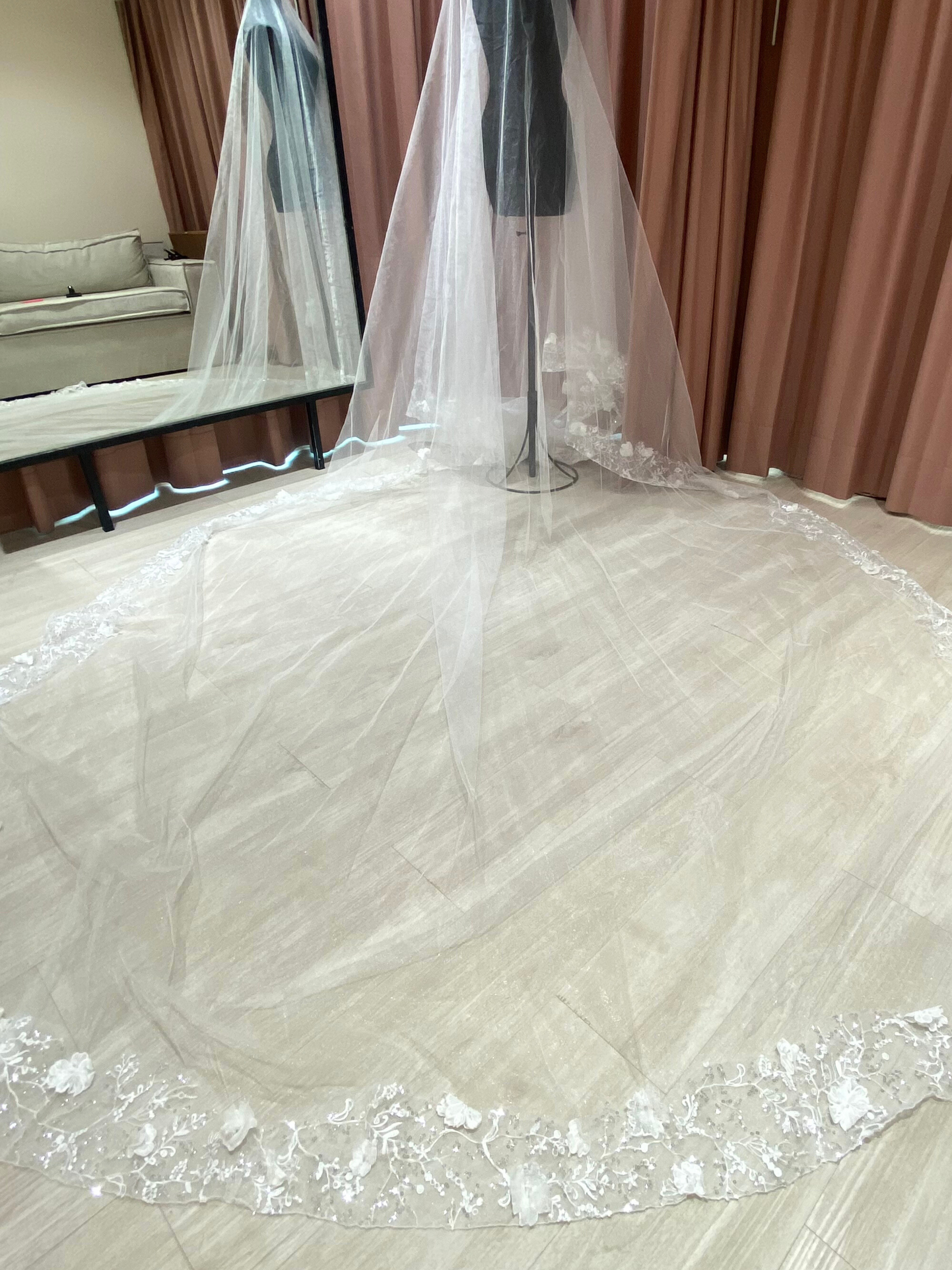 Velo de tul de novia con glitter y aplicaciones bordadas de encaje y 3D con destellos plateados incluye peineta