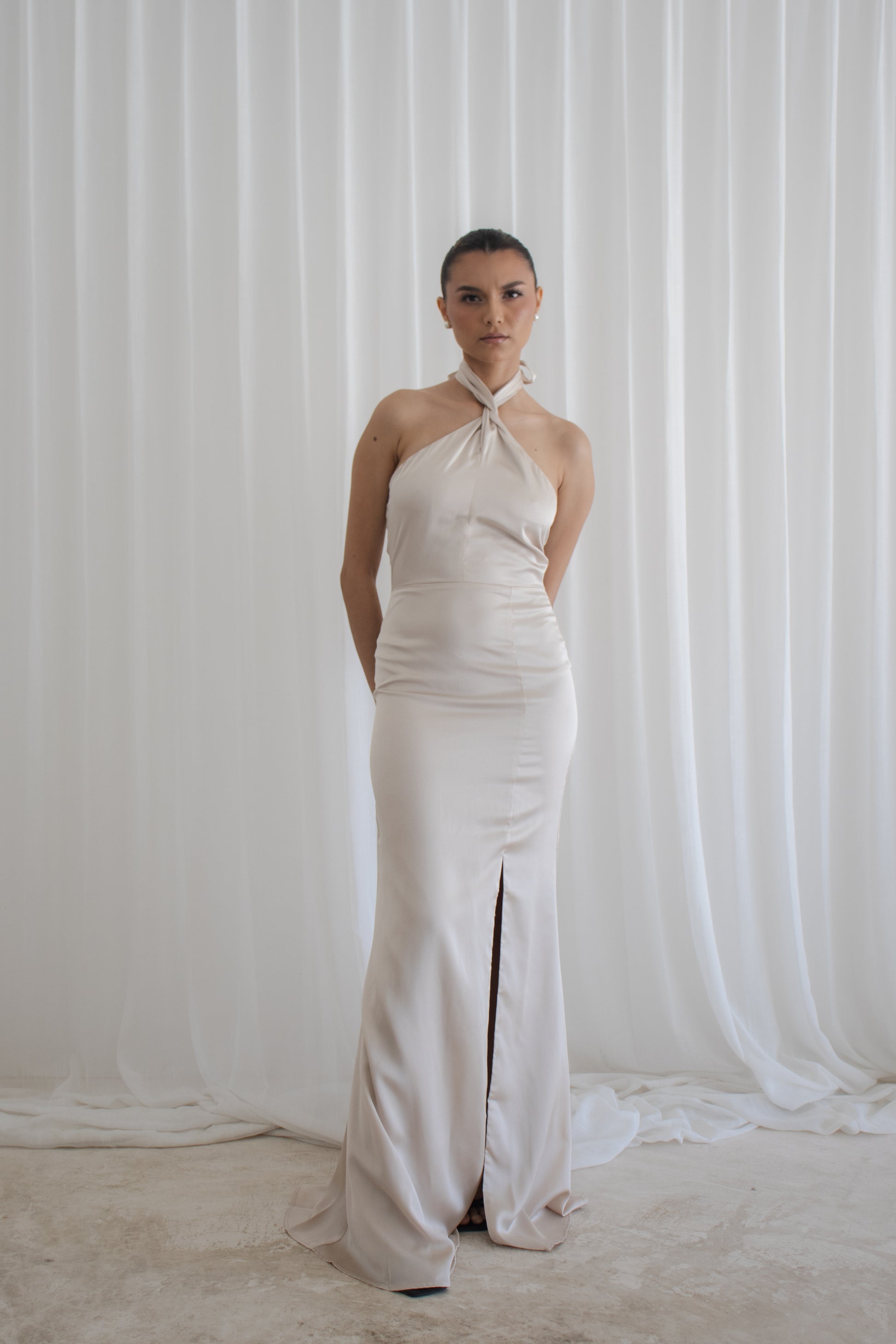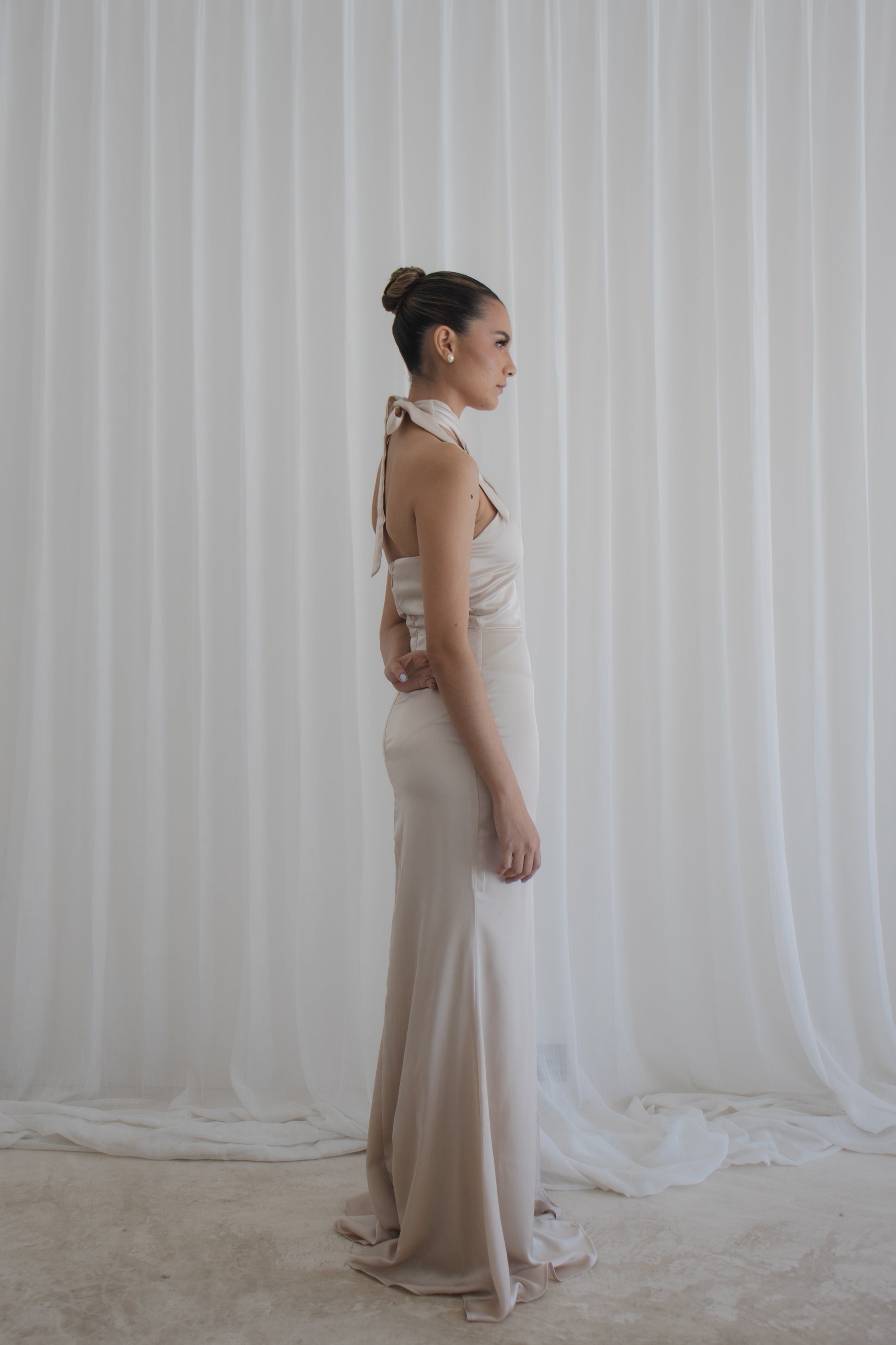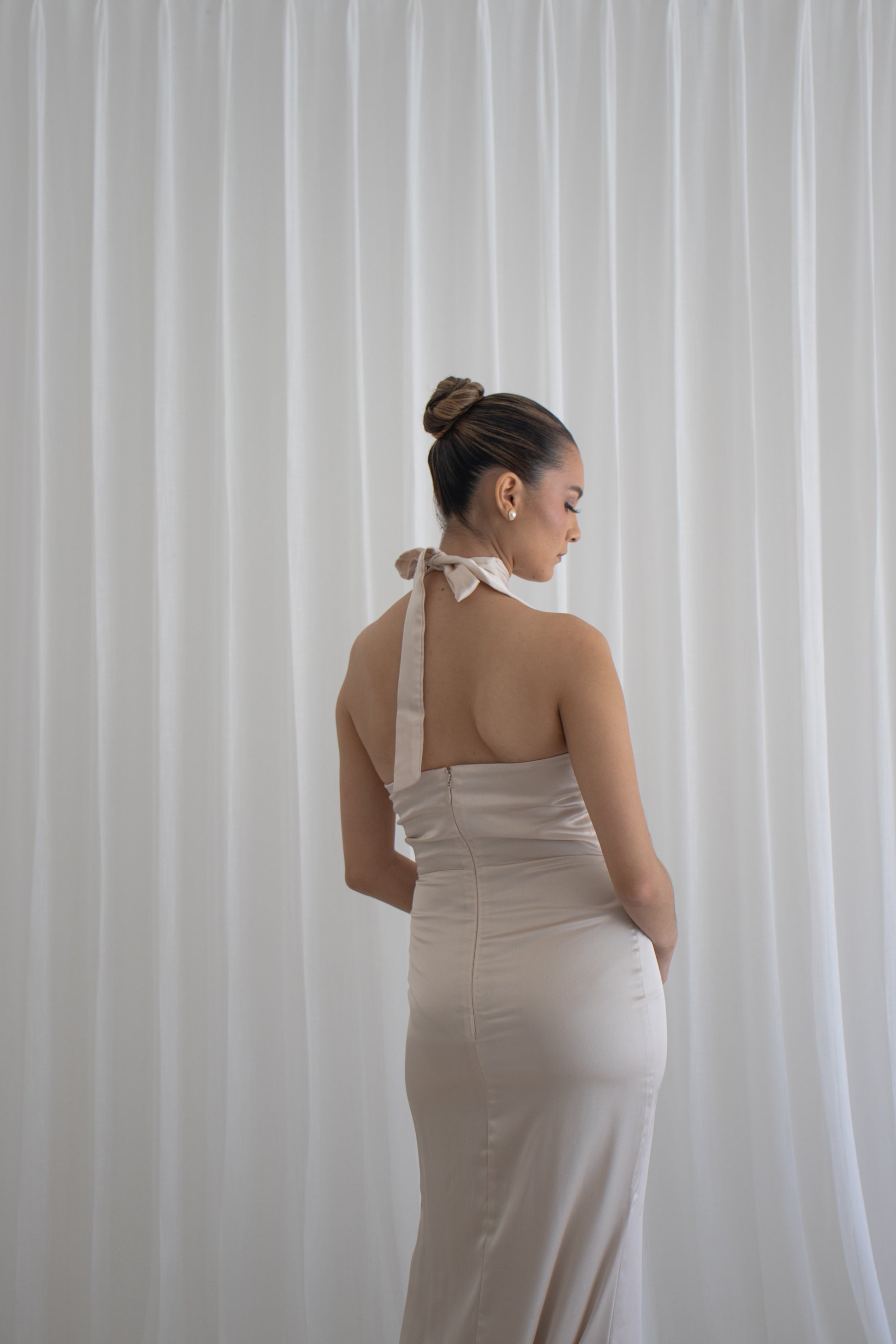 Vestido de ligero con cuello halter ajustable en tono Champagne