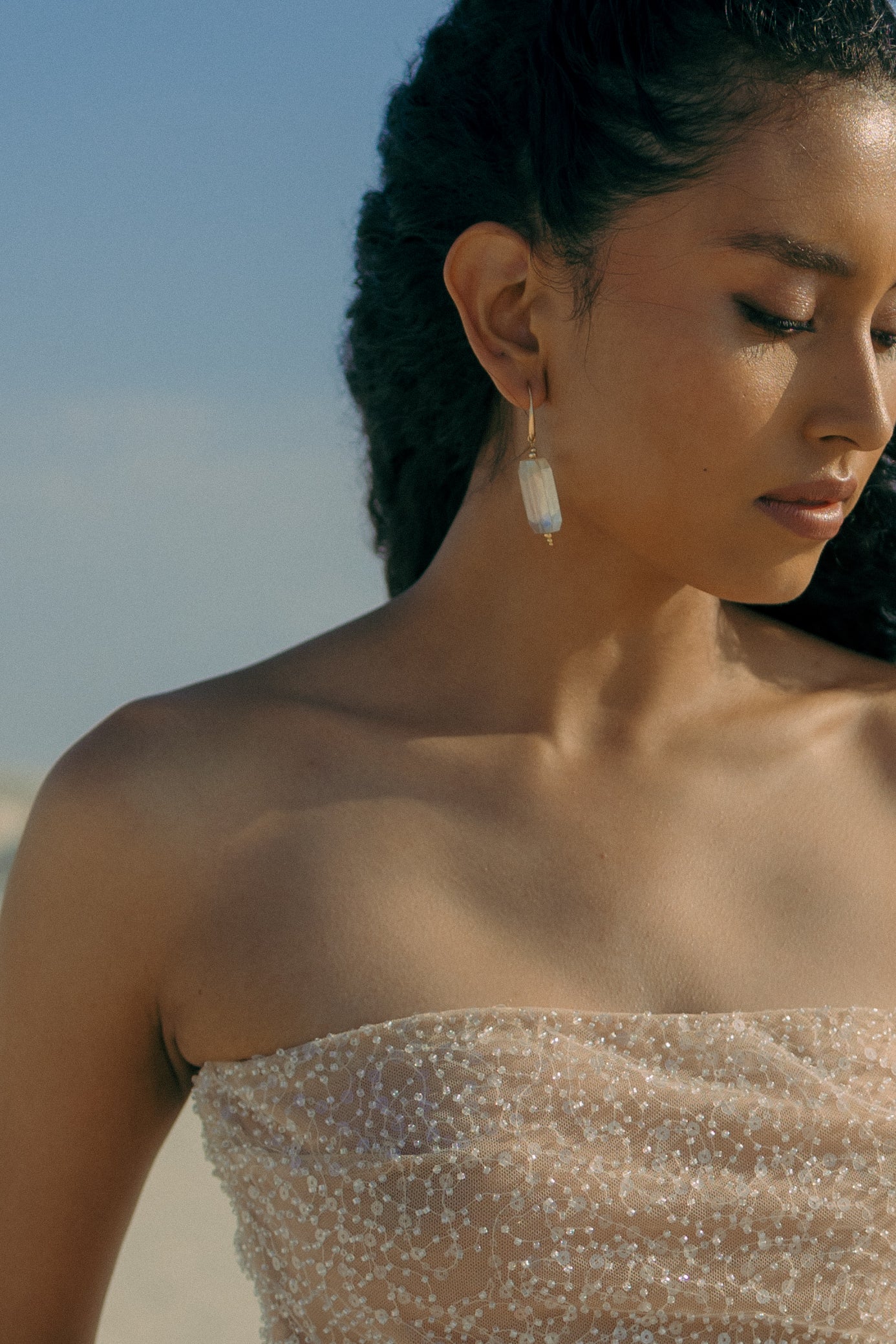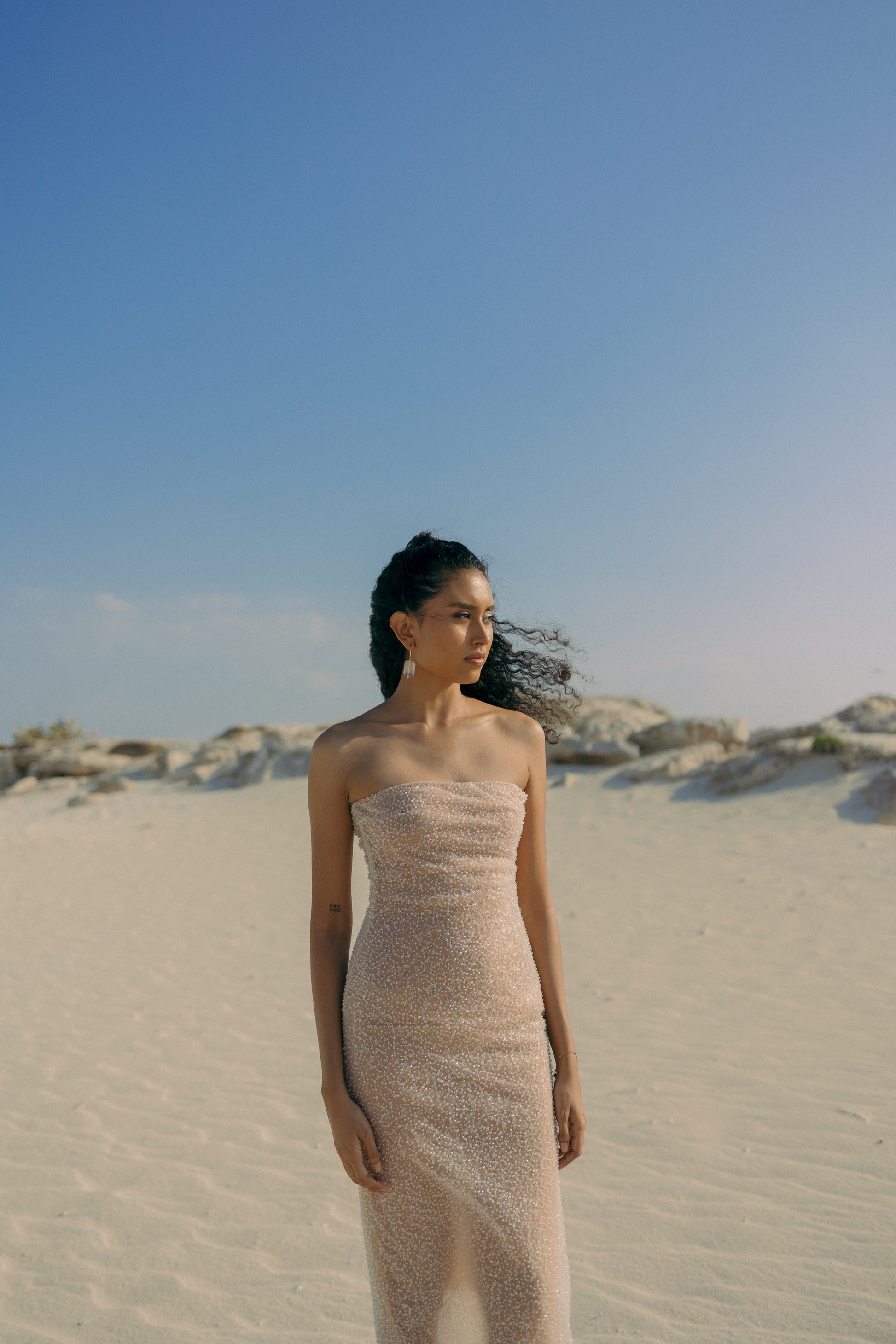 Vestido strapless de cierre con forro (transparente) de tul en tono champagne y capa superior de tul con cristales transparentes
